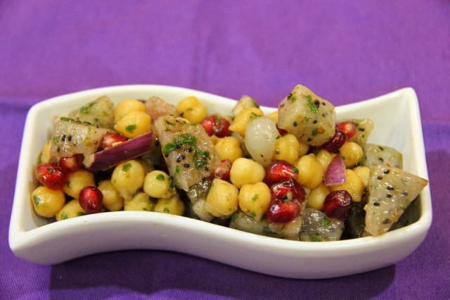 When you have a lot of fruit left in your fridge and don’t know what to do with them,here is a healthy salad with chickpeas and tangy spices.This recipe uses Dragon fruit usually found in Asian markets.