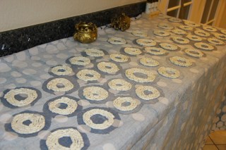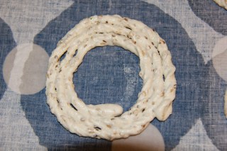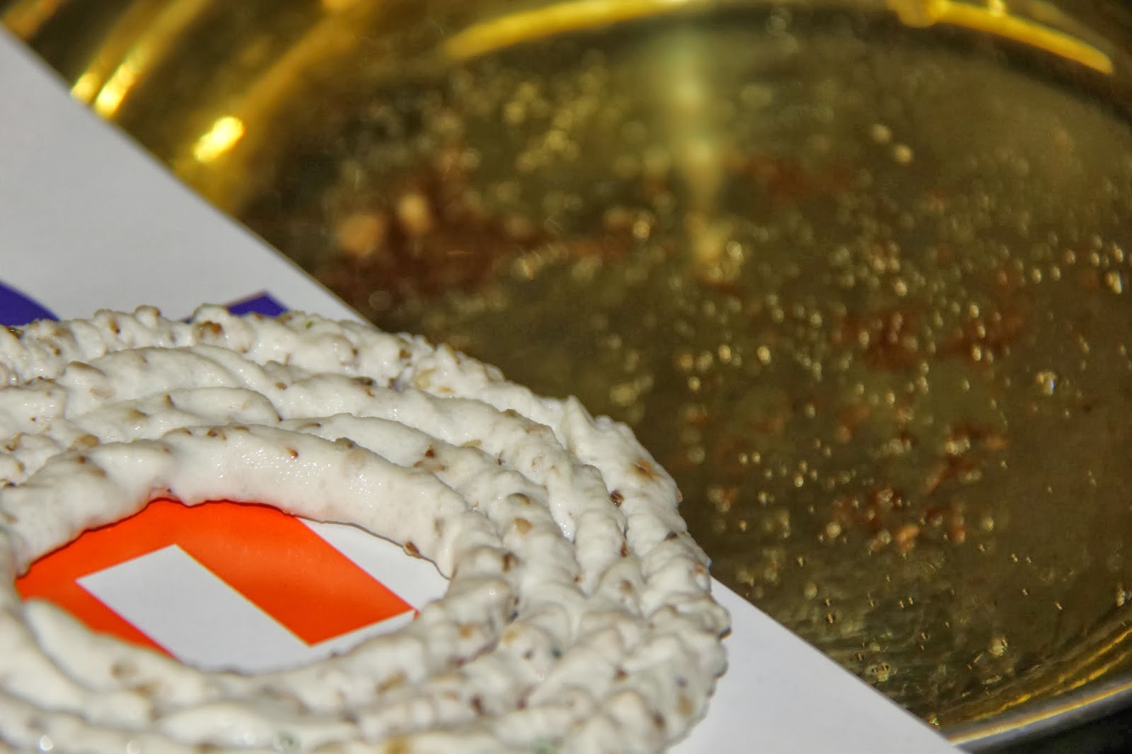 5.Spread a clean cloth or bedsheet on a counter. Take a lemon sized dough in the hand and gently with your fingers start releasing the dough in a fine tube, simultaneously twisting it and make concentric circles. Repeat until all dough is complete. Let rest and dry for 2 hours.