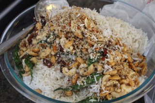 1.Cook rice with 4 cups of water, coconut milk half the cashews and salt.Spread on a plate and set aside to cool.