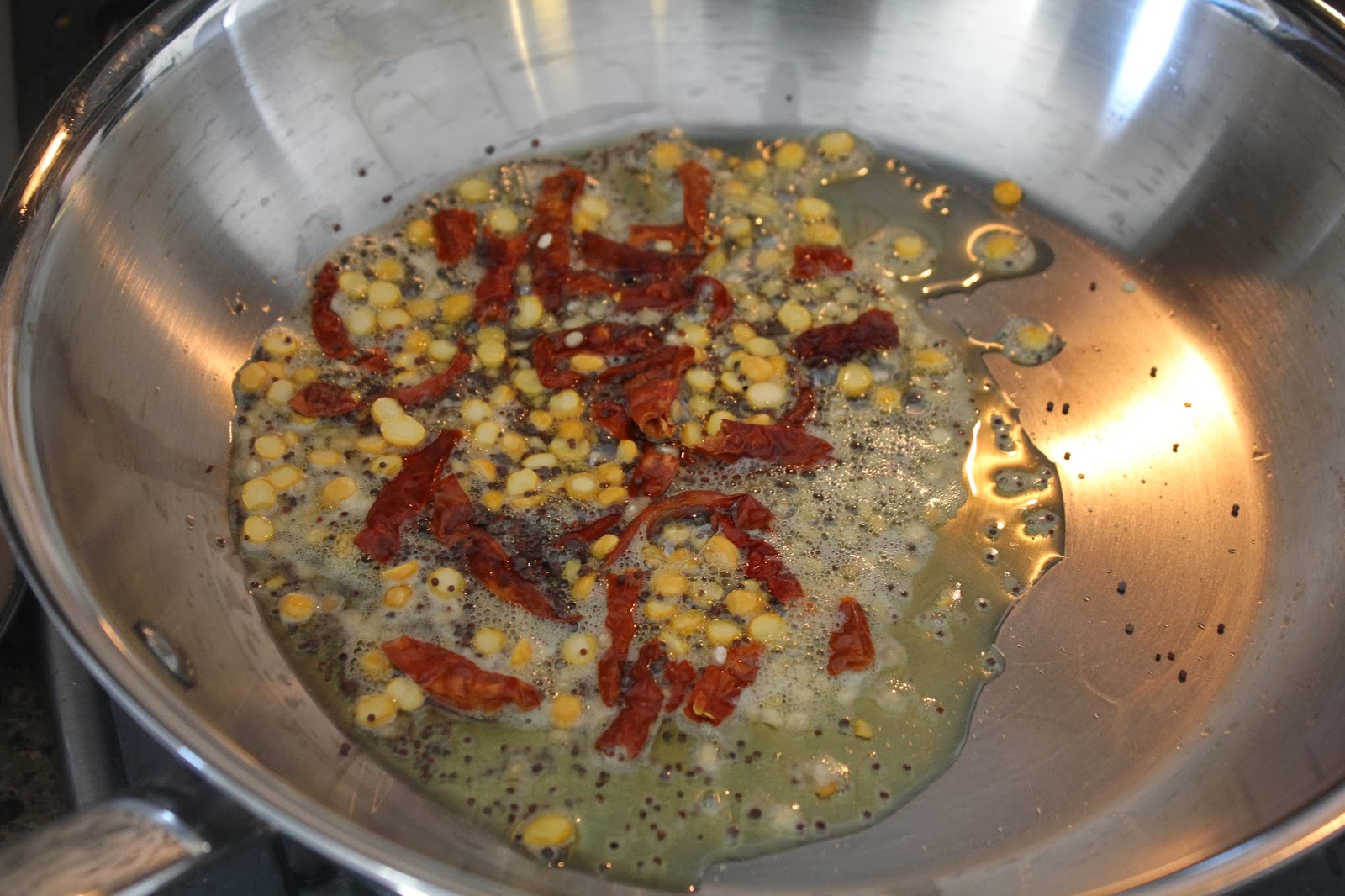 2.In a pan, heat the ghee, Add mustard seeds and let splutter, add red chili, urad dal and chana dal and let brown lightly.
