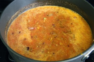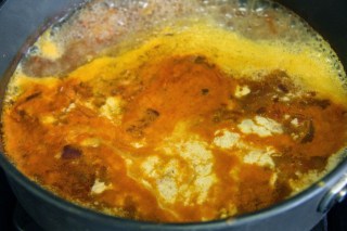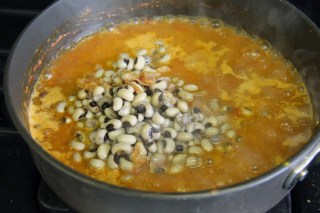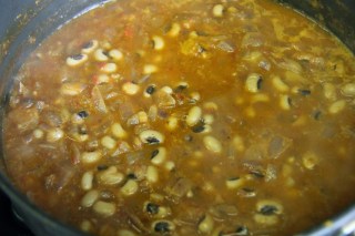 6.Add the coconut milk, water from the black eyed peas and let it simmer until it forms a slightly thick sauce.