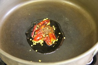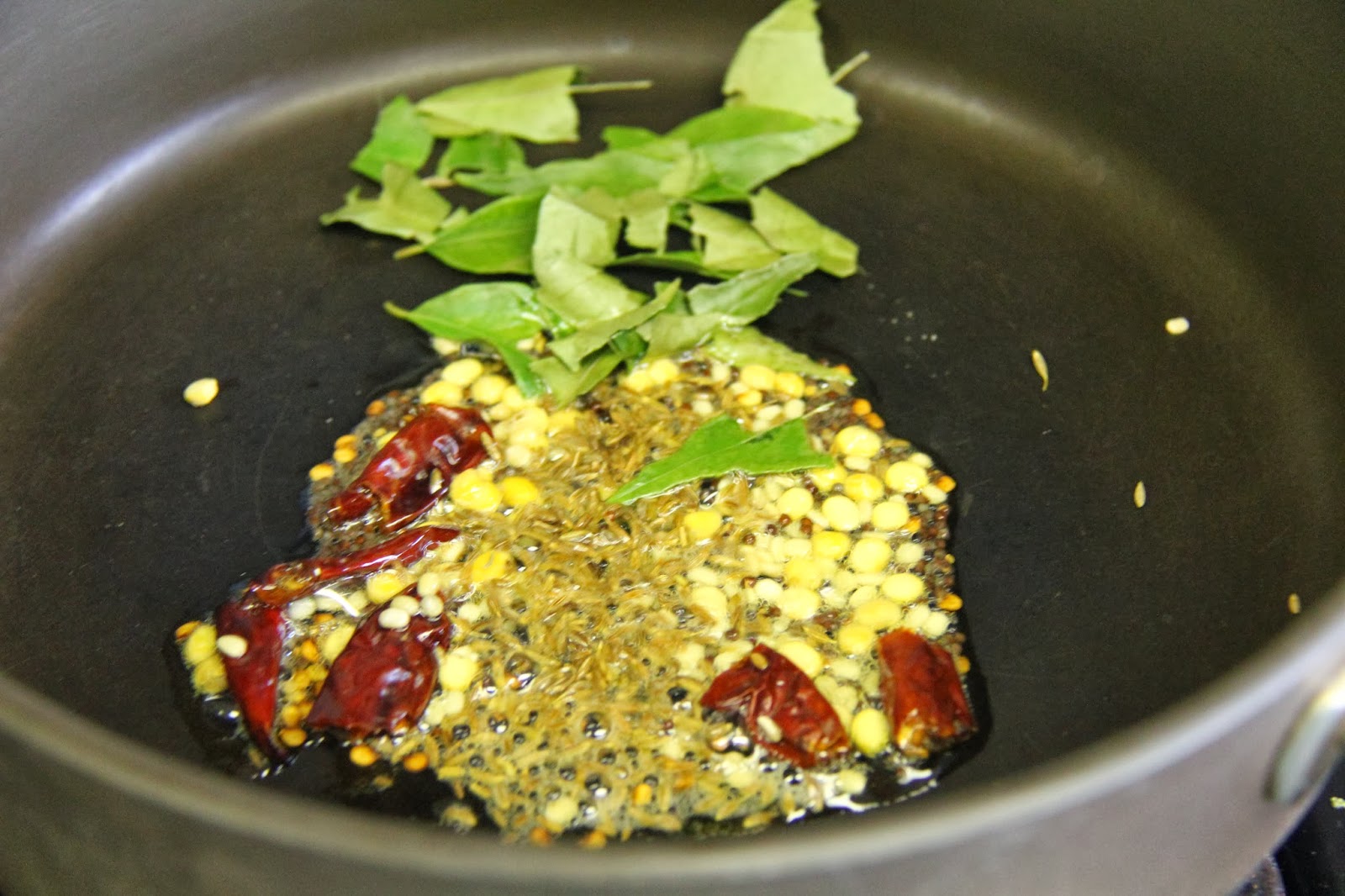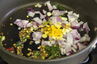 2.Add the chana dal,urad dal and let brown lightly,then add the cumin seeds and curry leaves and saute.