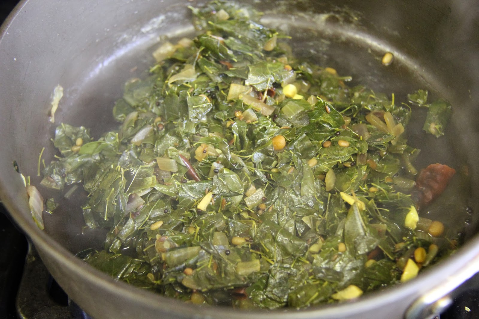 4.Add the drumstick leaves and saute for 1 minute.Add 1/2 cup water,turn the heat to medium,cover with a lid and let cook for about 5 minutes,the raw taste should disappear,if its still raw,you can add more water and let cook.