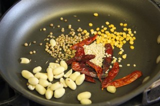 1.Heat a pan and add cumin, red chillies, 1/2 teaspoon urad dal, chana dal, coriander seeds and peanuts and dry roast them until they turn golden brown and turn off the stove and let cool.
