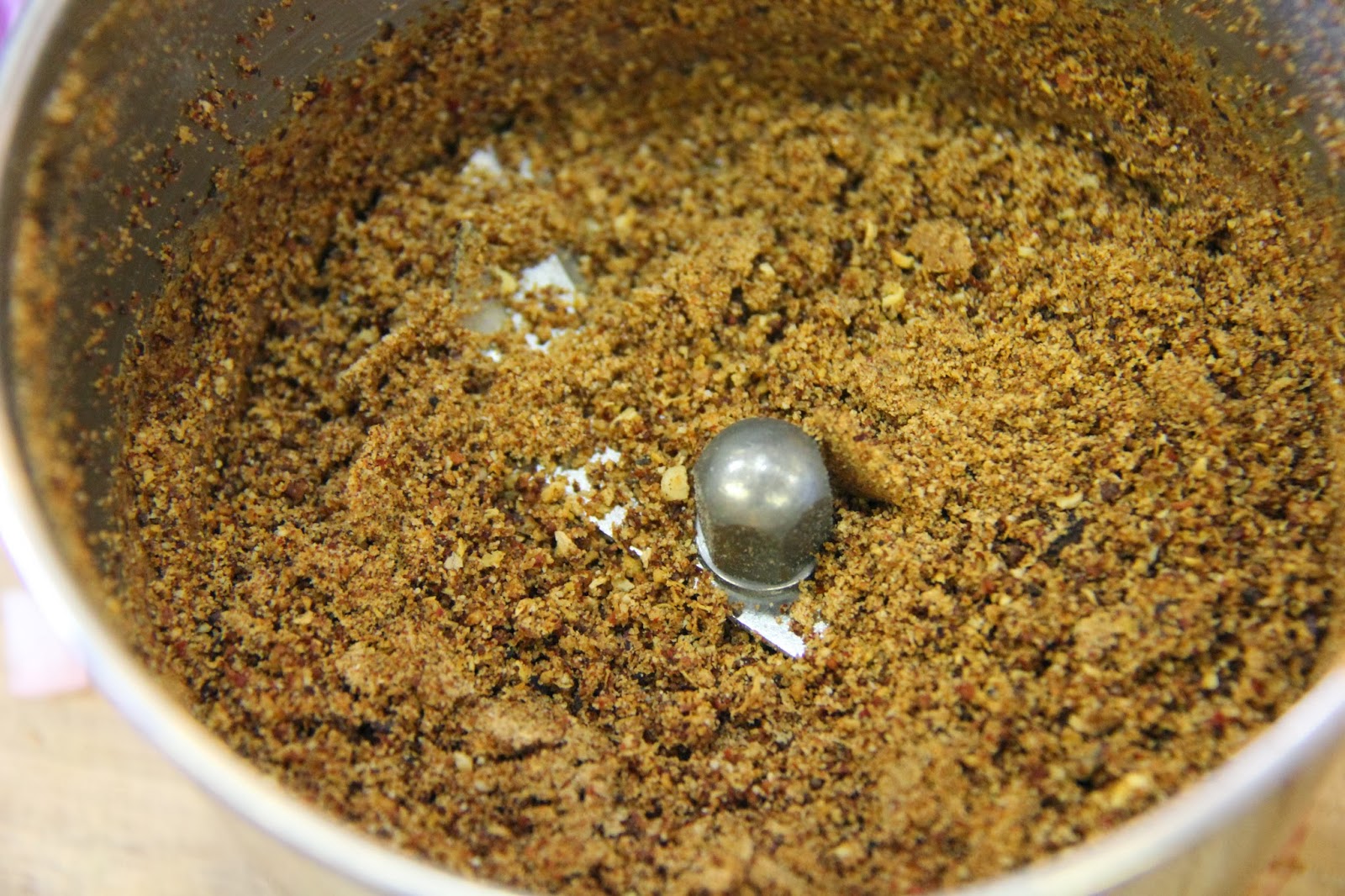 2.Grind the roasted ingredients to a powder, then add tamarind,green chili and salt and pulse once more.Add in the coconut and pulse a couple of times just until combined. The mixture should be coarse.