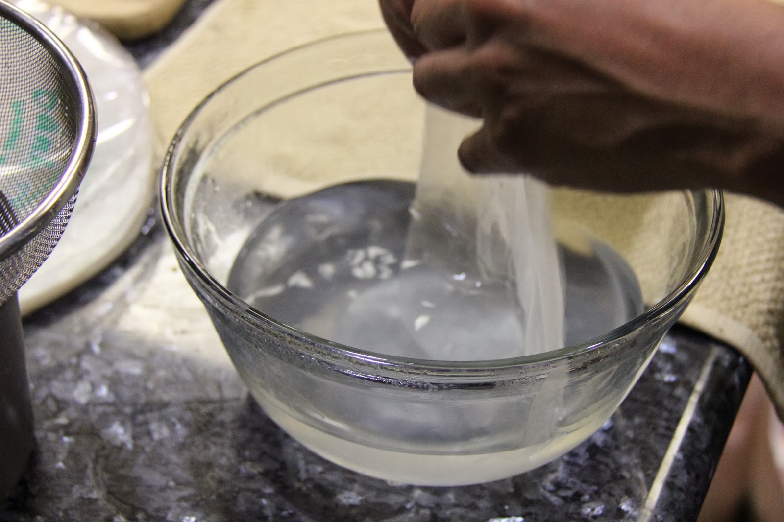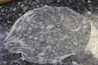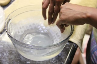 2.Heat 3 cups of water and keep it in a wide mouthed bowl. Dip the rice paper in the bowl and turn it around until all sides are soaked. Be gentle with it or it will tear. As soon as it gets soft remove it from water and spread on a dry dish cloth or on a clean surface.The soaked rice paper should lose its stiffness.
