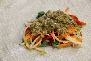 6.Now applying gentle pressure start rolling the vegetables with the rice paper towards the other end.