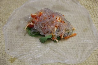 3.Place 1 leaf of greens in the center on the rice paper and place the mint and cilantro on top and then the grated veggies.If you like you can put tofu or cooked shrimp as well on top.I used a tofu mushroom sauteed mixture.Finally place the noodles.