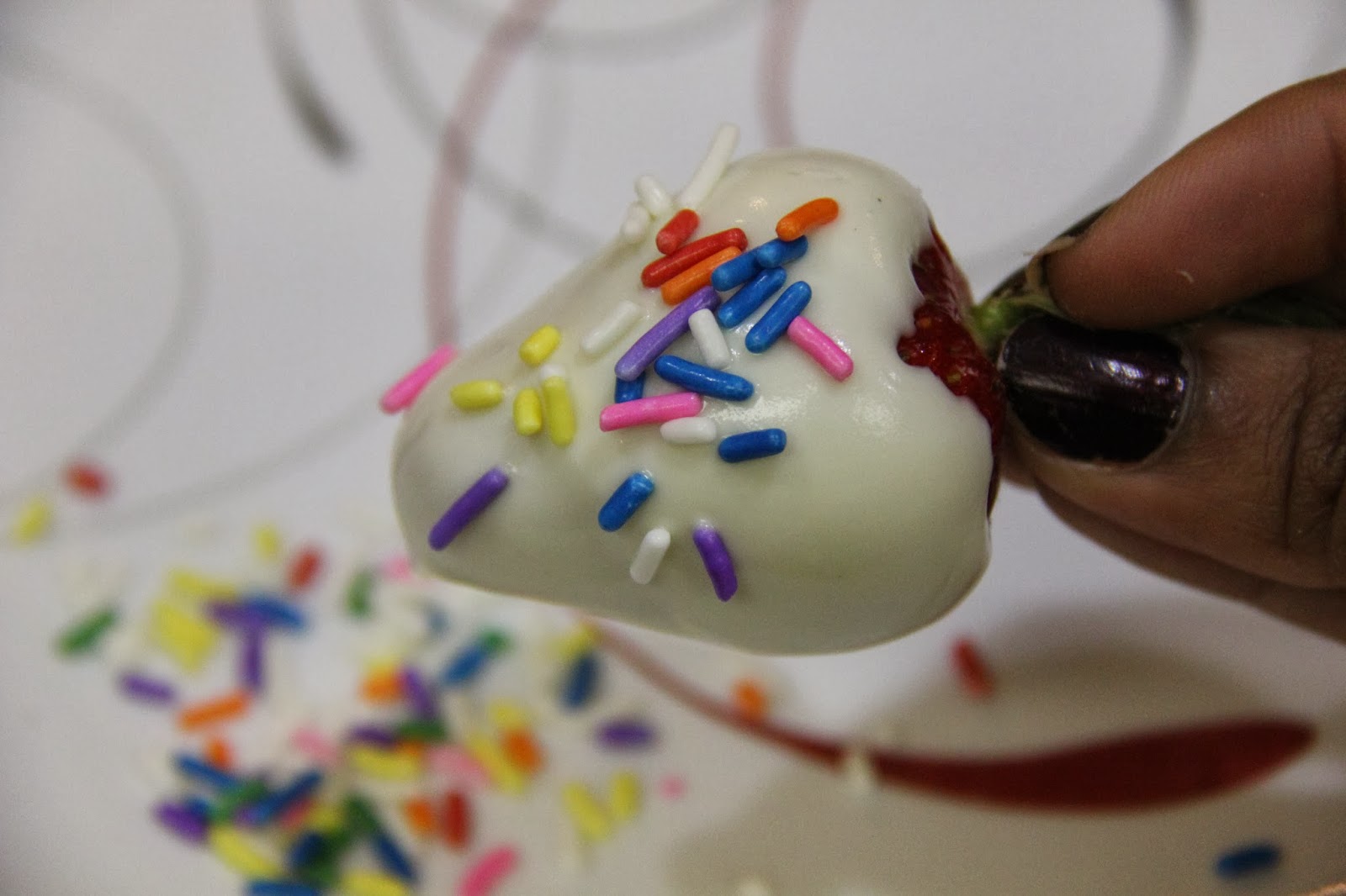 5.For variations you can spray sprinkles,chocolate chips etc immediately after dipping in the chocolate and let them dry.Hold the dipped strawberries over a plate and sprinkle them and place on parchment paper.