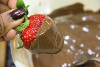 3.Hold the strawberries by the stem and dip them in the chocolate and rotate them until they are coated all around.