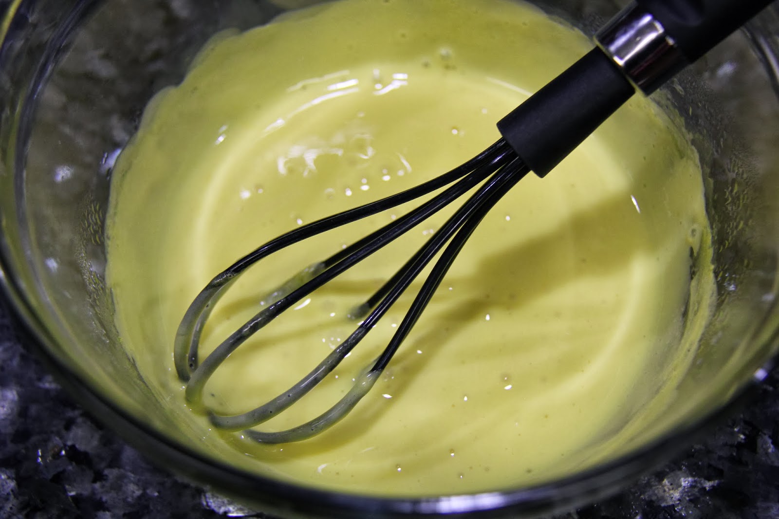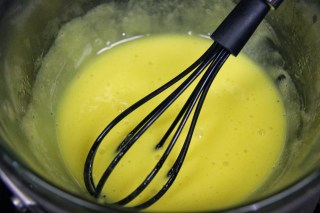 1.Heat water in a pan,place another bowl over it and on low heat take the egg yolks in the top bowl and start whisking until you see a pale and viscous texture and remove from stove.