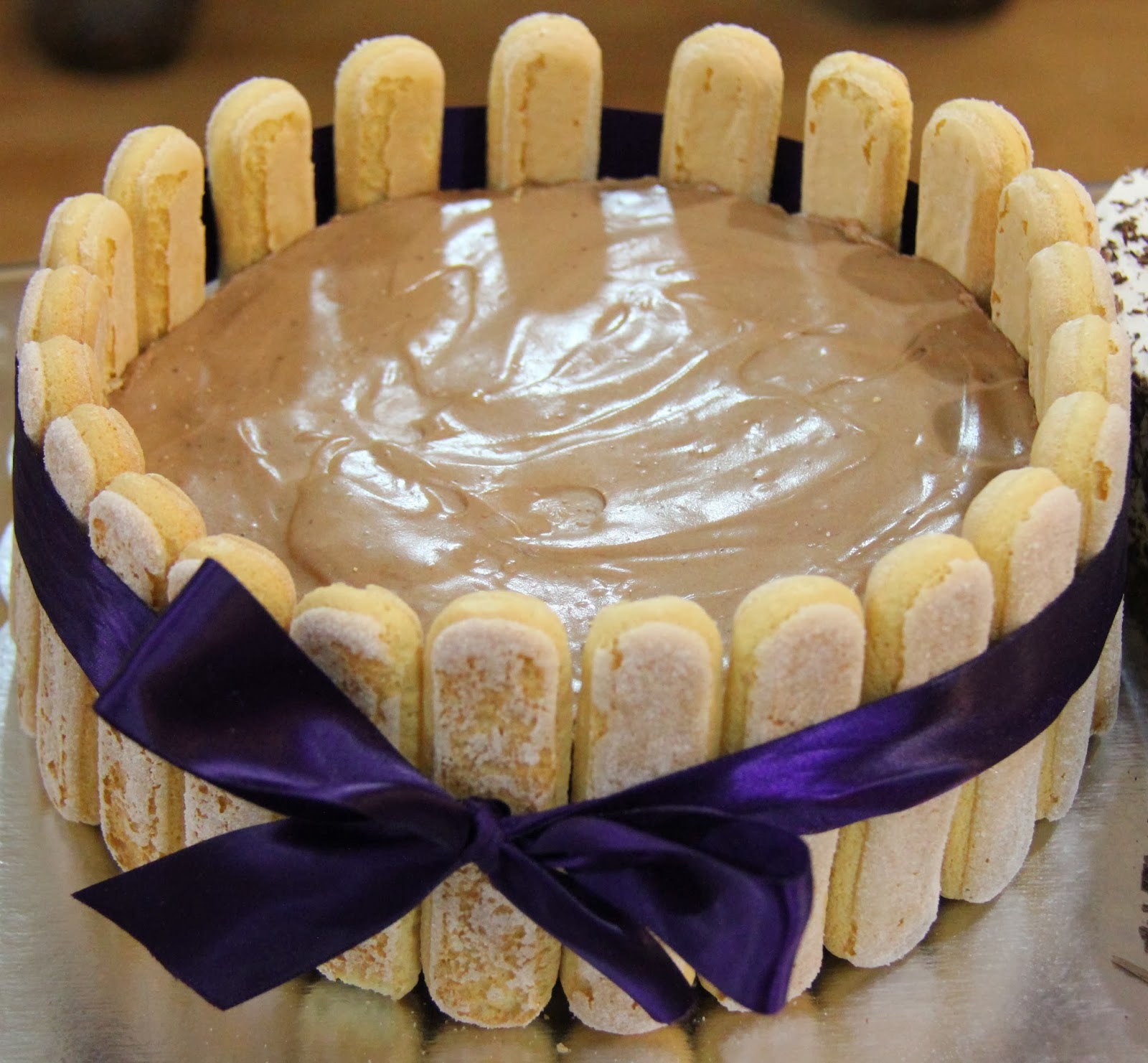 13.To assemble the cake,after a day remove the springfoam pan and place ladyfingers all around the cake and tie them together with a ribbon.