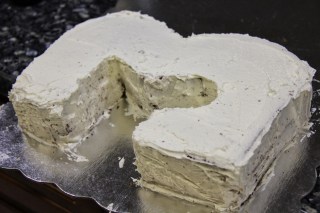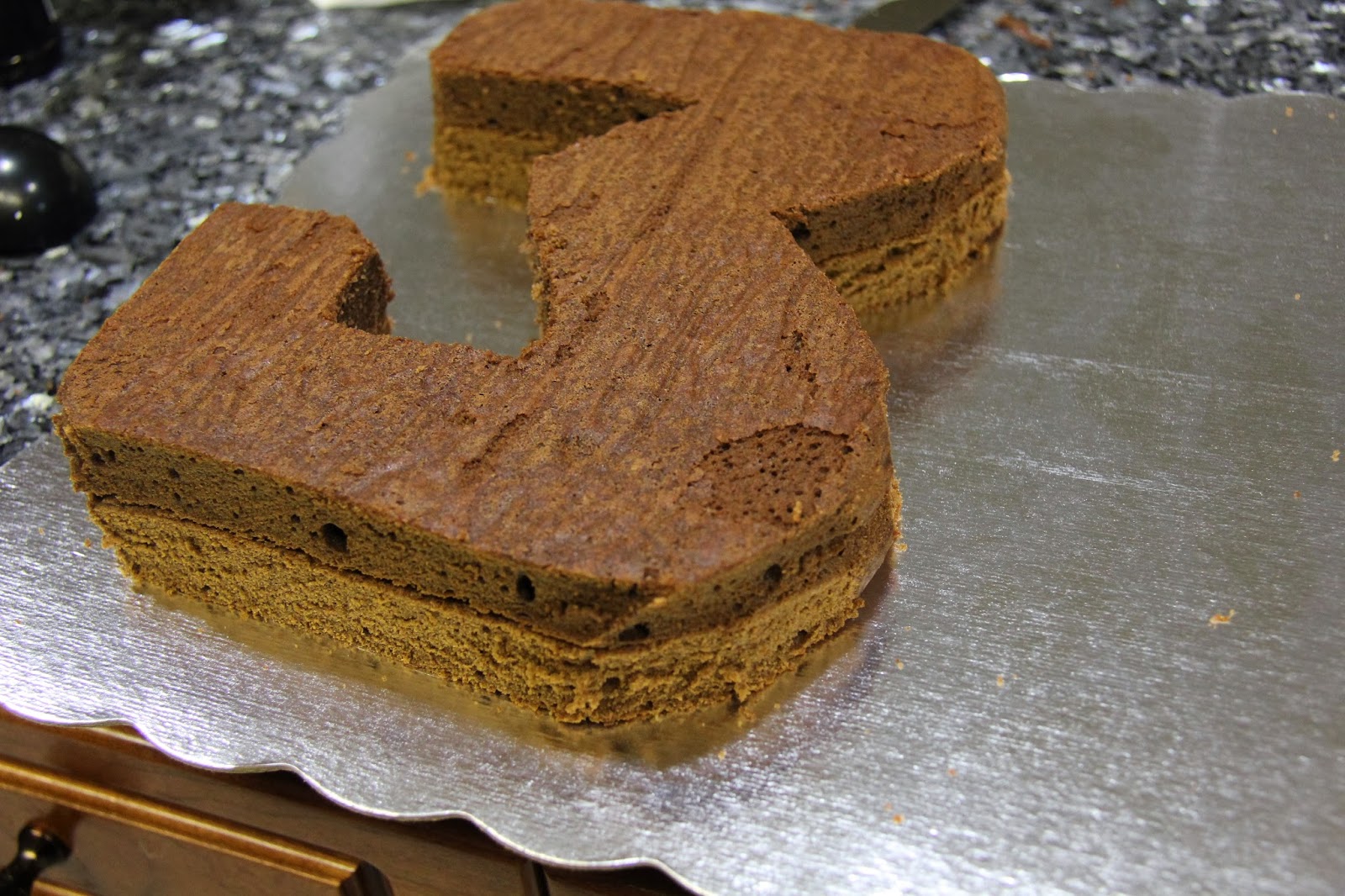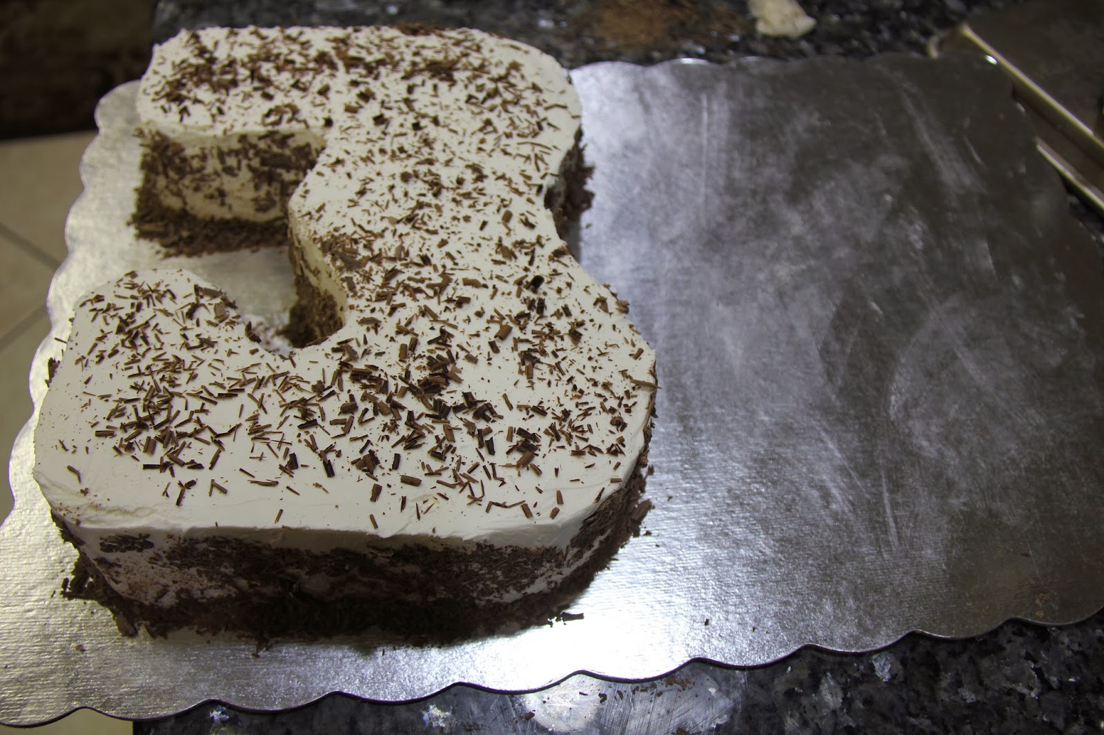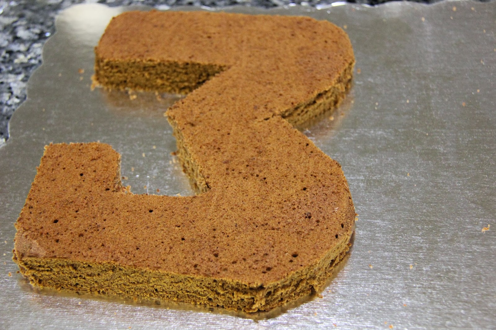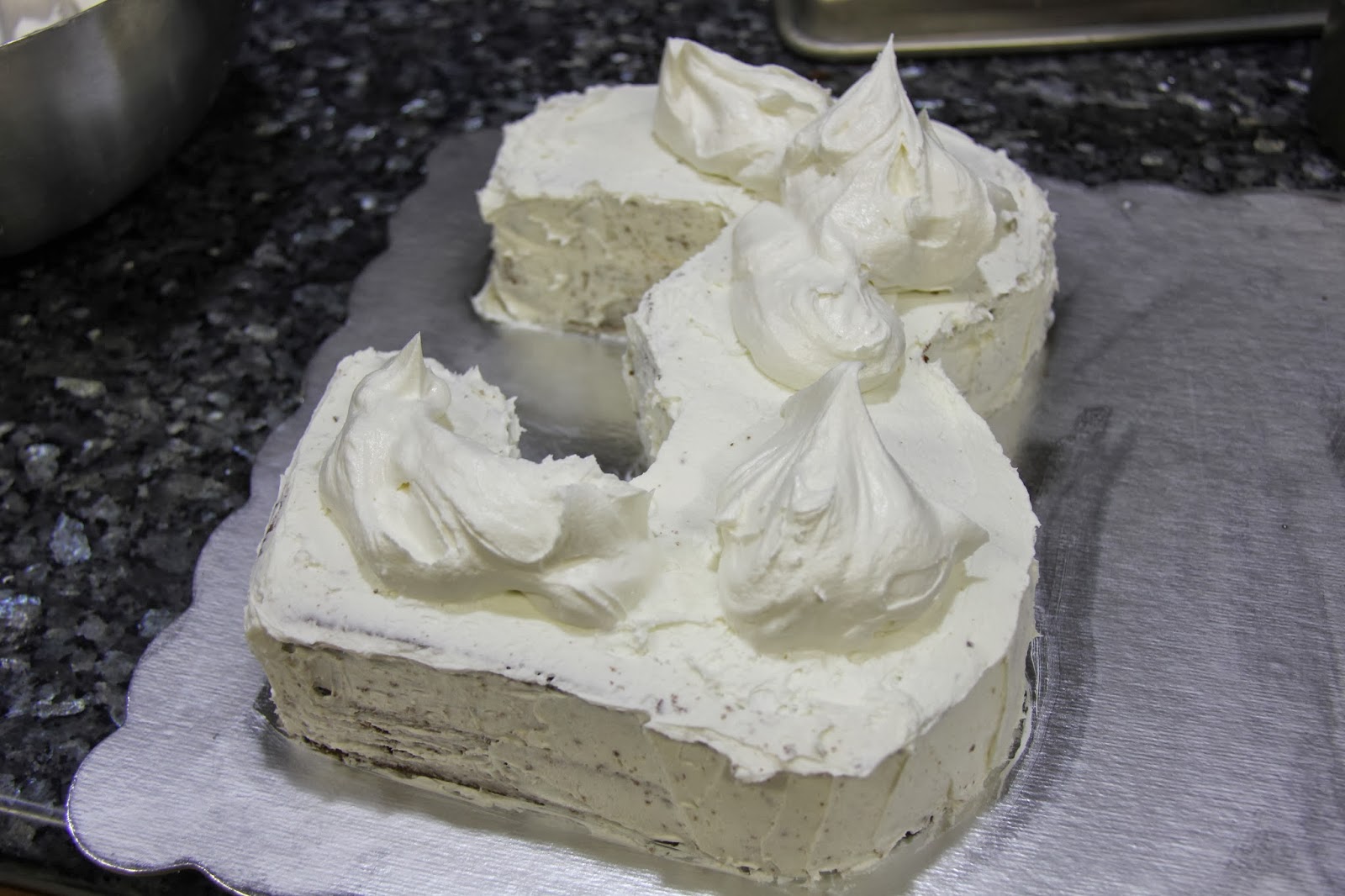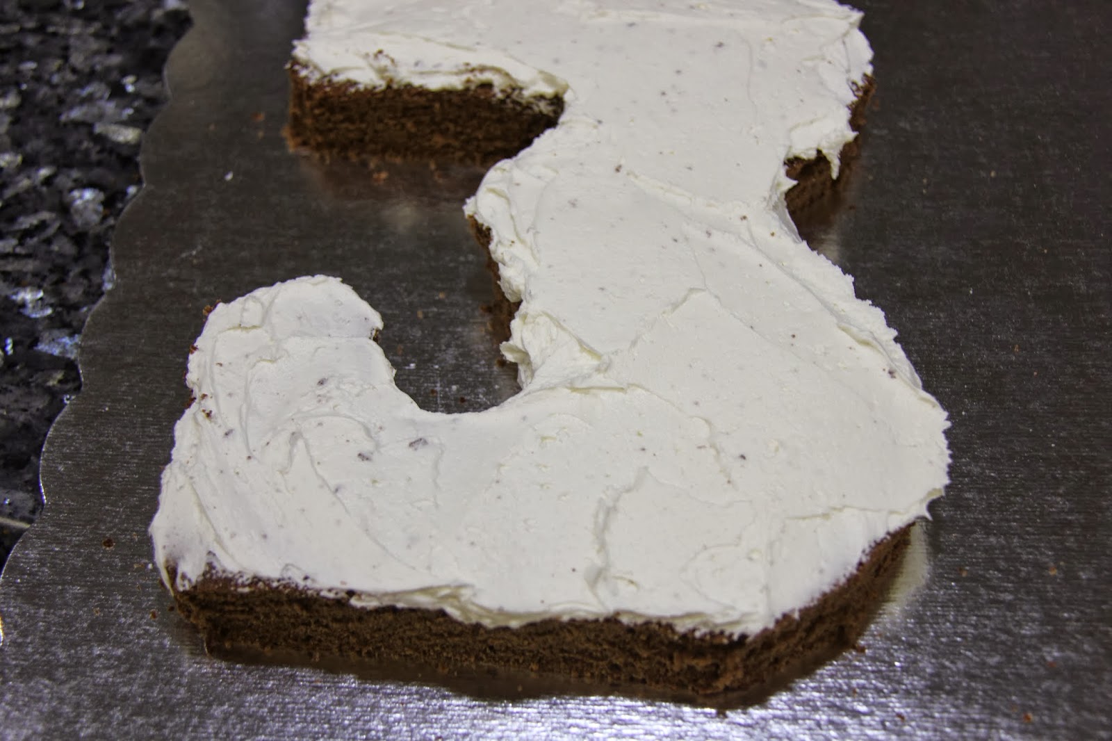 6.For icing,I used White Chocolate Buttercream,I wanted to make a shape of 3,so I baked 2 half sheet pans and placed them one over the other and cut them in the shape of a 3 with a knife.