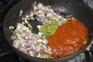 3.Add pesto and spaghetti sauce to the mushroom onion mixture and mix.Check salt,add crushed red pepper flakes for spice.The sauce should not be watery,so let it cook until it comes together and water evaporates.Turn off the stove.