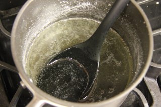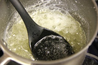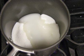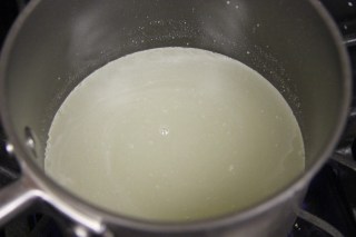 6.Take the sugar in a separate pan and heat it with 1/4 cup water. Boil the sugar and water into a rolling boil. The test is when you put a drop of the syrup in cold water it will form a light shape but when you shake it, it will dissolve.Keep the syrup warm on the lowest flame.