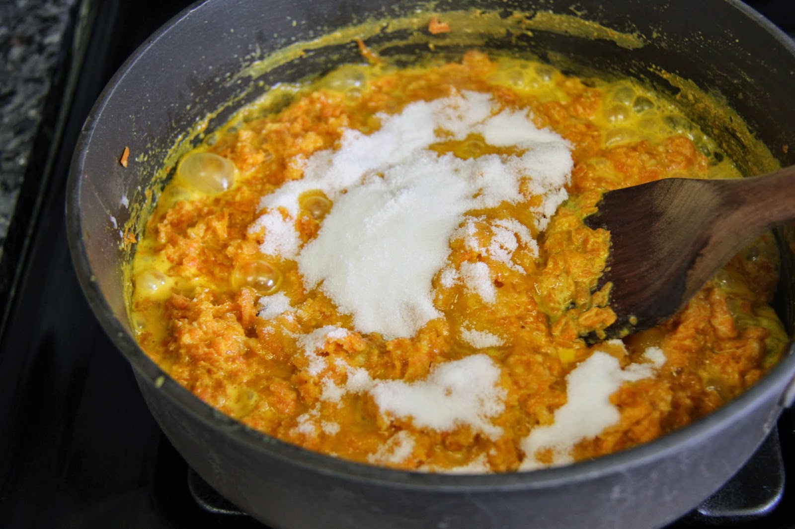 1.Heat 1 tablespoon ghee in a pan and roast the grated carrot on medium flame until they lose a little moisture,there shouldn’t be any water collected at the bottom(about 8 minutes).Stir so that the carrots don’t burn.