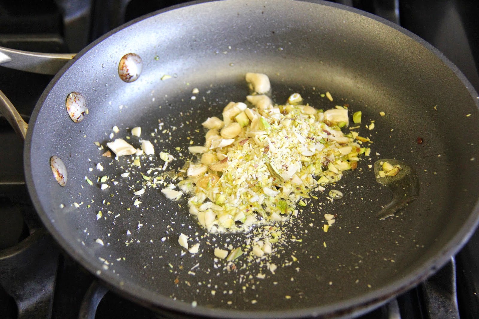4.In a separate pan take the nuts and roast them separately in 1 teaspoon ghee and add it to the carrots and mix.