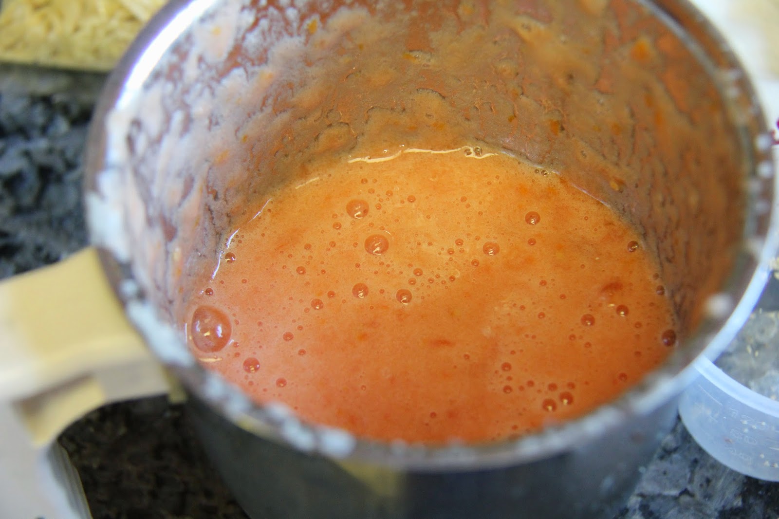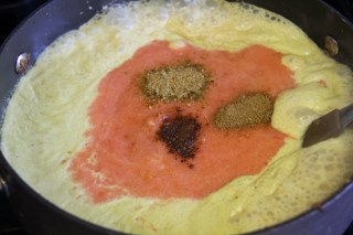 8.Add the pureed nut paste,tomato paste and the rest of the spices,mix and cover with lid and let simmer for about 20 minutes until the oil floats on top.Adjust spice and salt.