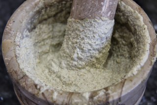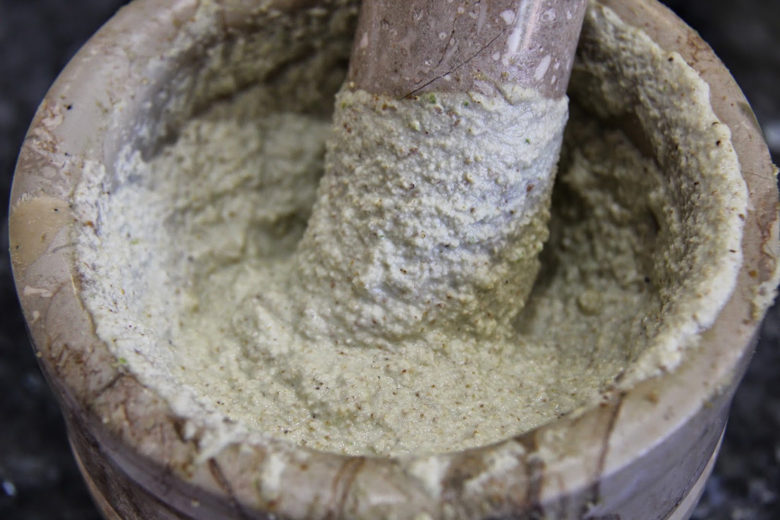 4.Remove the cashew and almond from water and grind them in the mortar or pestle or spice grinder along with the poppy seeds and green chili to a fine paste.