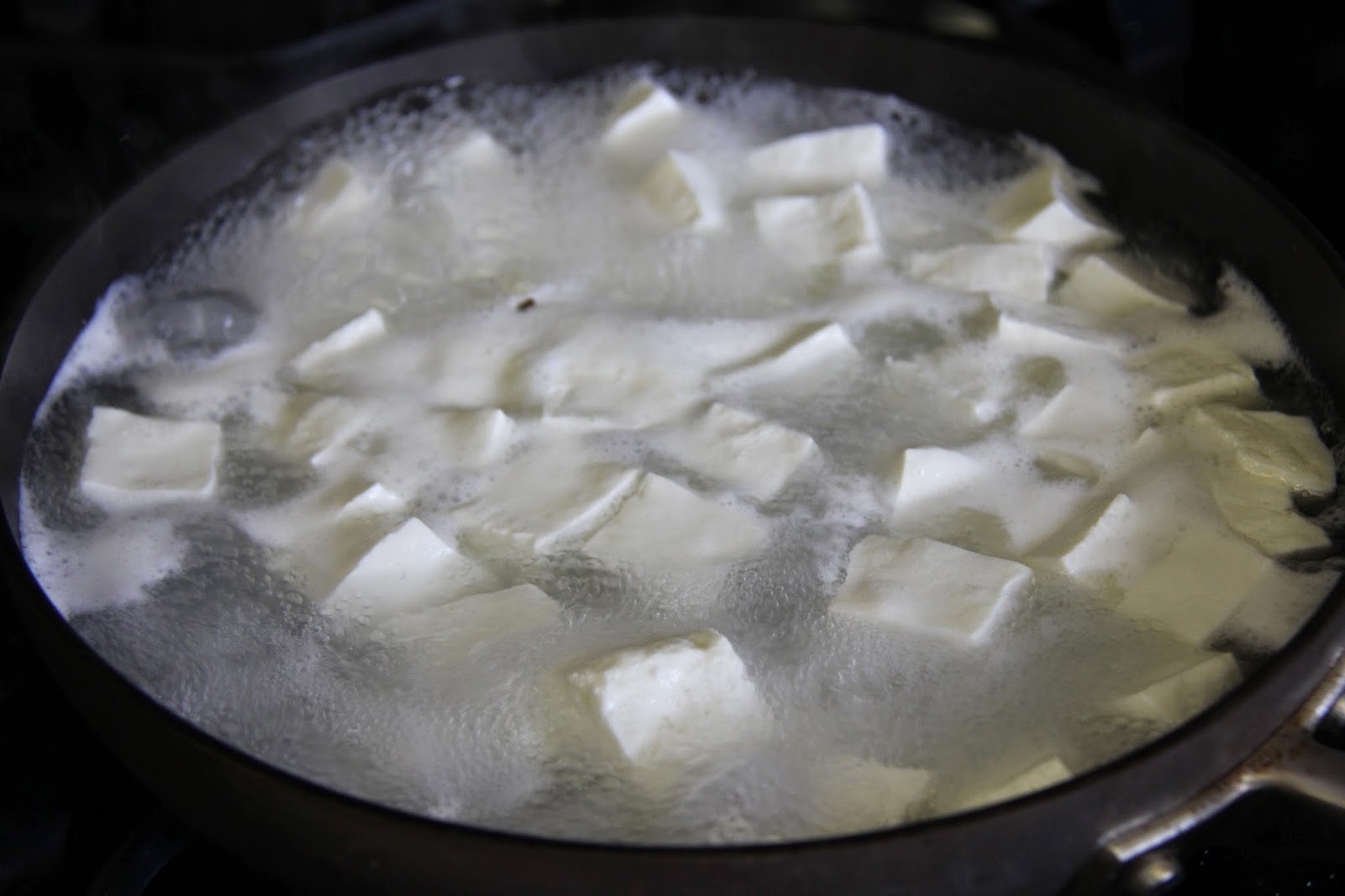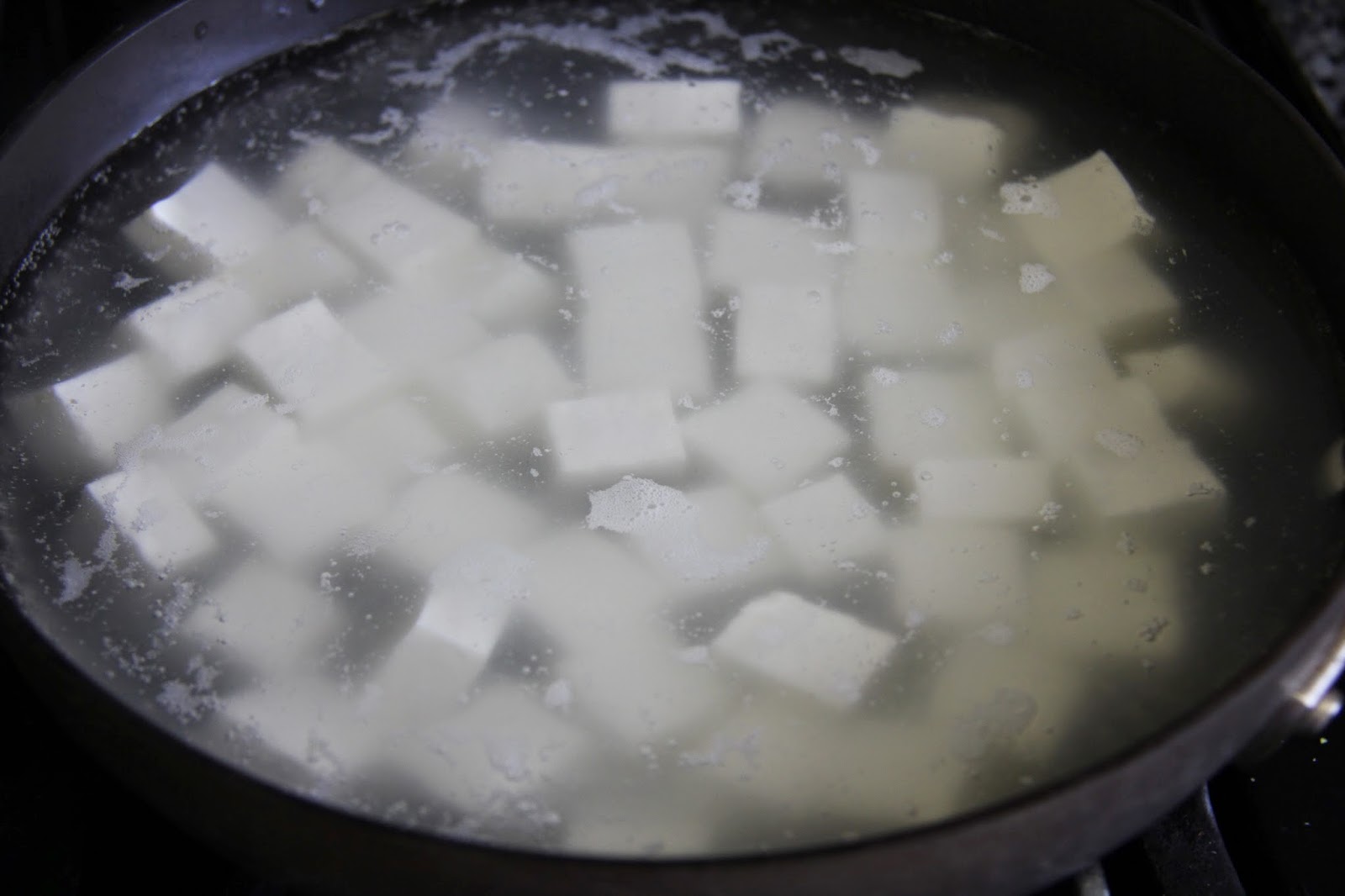3.In a pan,bring 3 cups water to a boil.Add the paneer cubes and let them boil.When the paneer starts to float switch off the stove and drain the water and keep the paneer aside.This is not normally done traditionally but this step adds airiness to the paneer and makes it easy to absorb flavor.