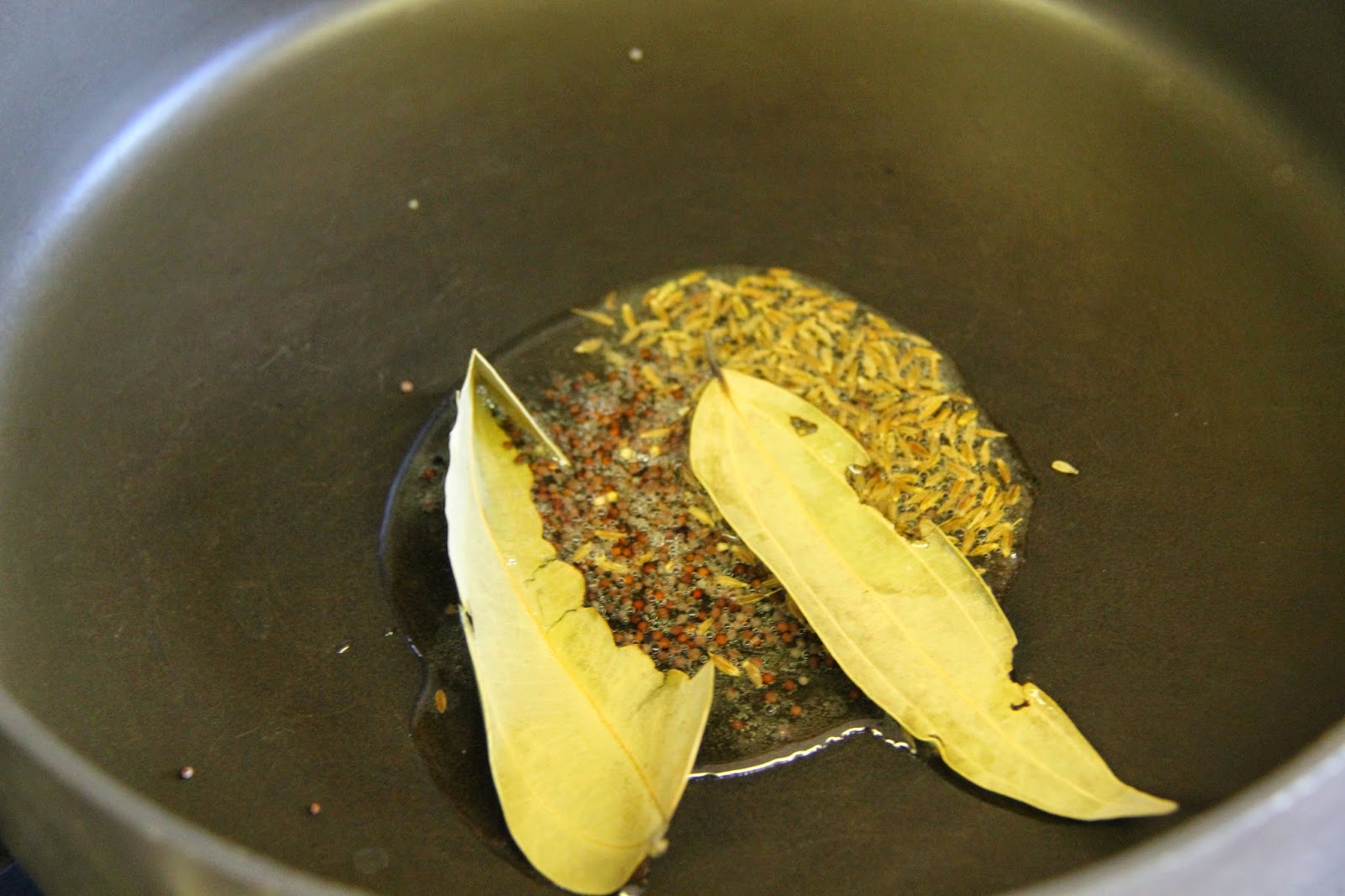 5.Heat the ghee or oil in a separate pan,add mustard seeds and let splutter.Add cumin seeds and bay leaf and saute for 1/2 minute.