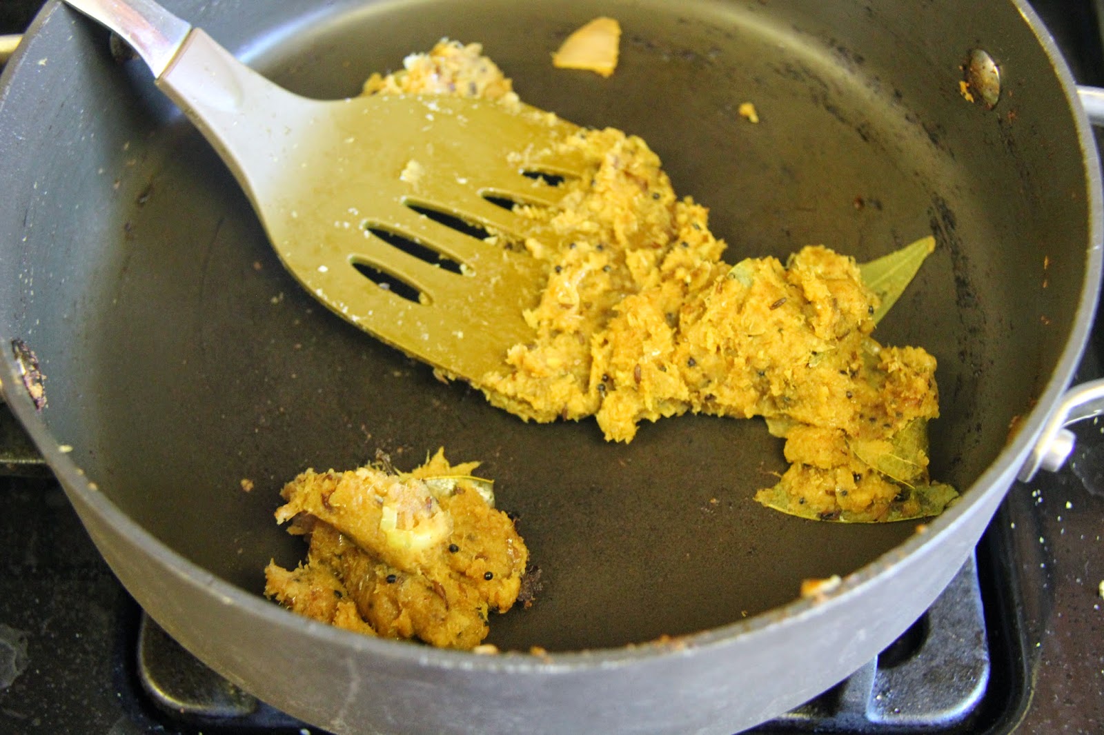 6.On a medium flame,add the pureed onion,salt and turmeric powder and saute the paste until it comes together in a single paste and turns golden,the raw smell of onion should go.If you are a beginner, use chopped onions instead of puree. Onion paste needs patience to cook properly(about 20 minutes) or it will spoil your entire dish.