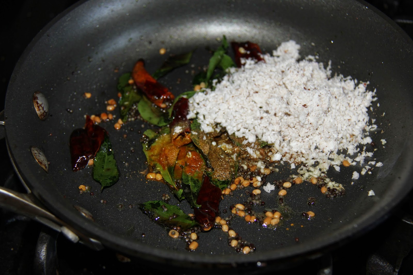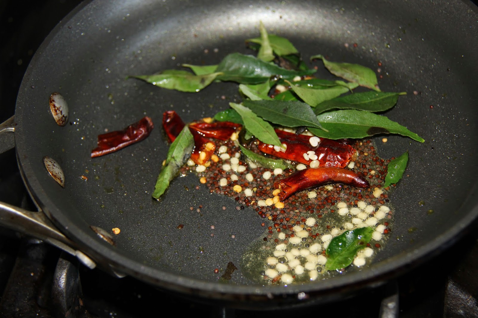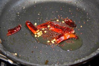 3.In a different pan heat the oil/ghee add mustard seeds and let splutter, add the red chili and urad dal and curry leaves and let splutter.