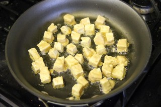 3.Take 1 tablespoons oil in a pan and roast the paneer cubes on all sides just until lightly browned. Remove from stove and drain on paper towel.