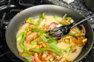5.Turn down the heat to low and add the soy sauce, vinegar, red chili sauce, sugar and combine.