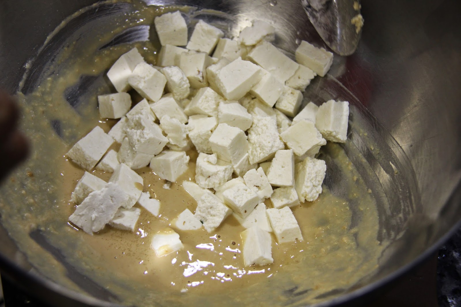 3.Take 1 tablespoons oil in a pan and roast the paneer cubes on all sides just until lightly browned. Remove from stove and drain on paper towel.