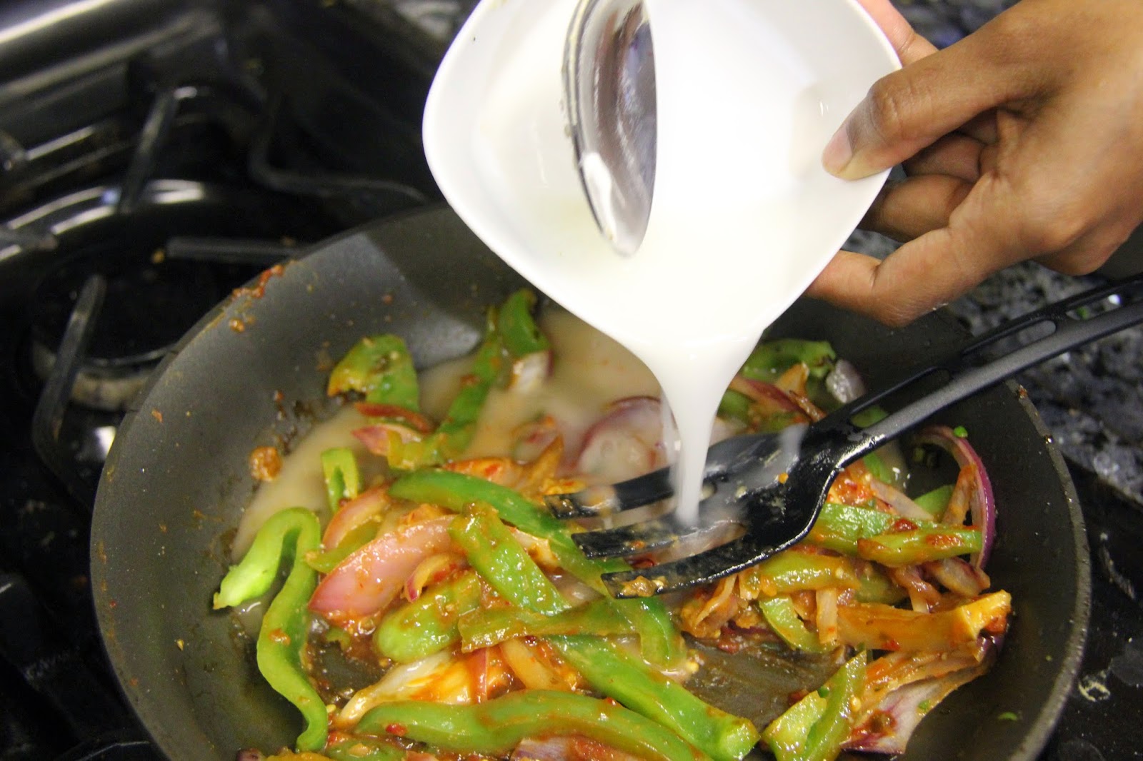 5.Turn down the heat to low and add the soy sauce, vinegar, red chili sauce, sugar and combine.