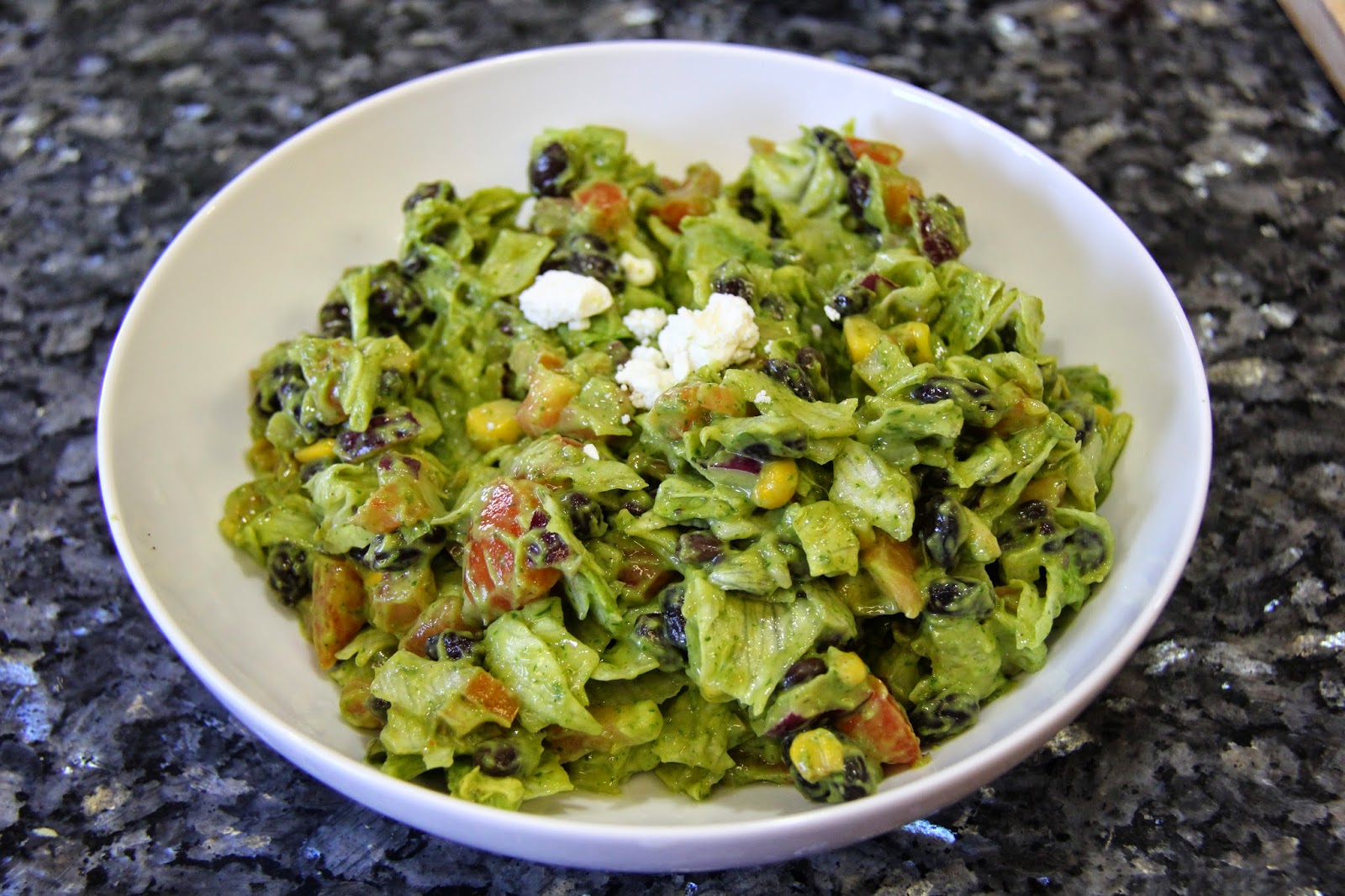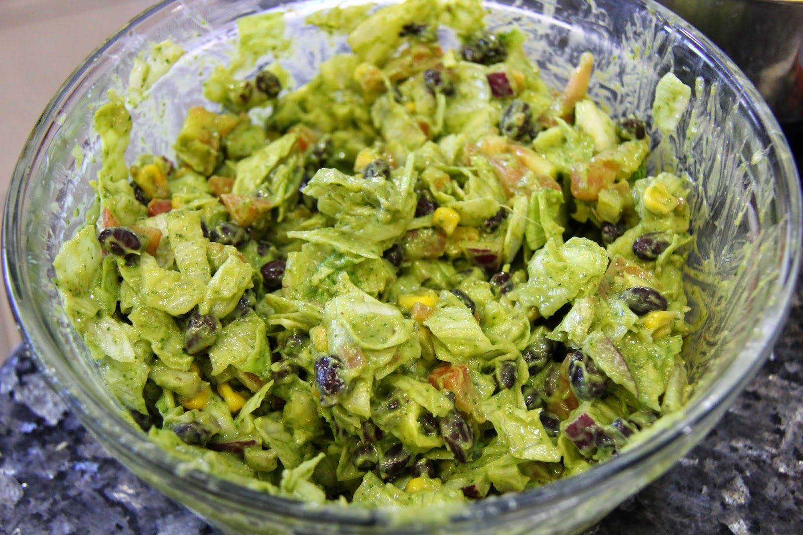 3.In a bowl take the chopped onion and tomato,corn and black beans and mix,Now add the ground avocado puree and toss along with the lettuce until evenly coated and serve.
