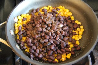 2.Roast the corn and drained black beans on the stove and sprinkle the cajun seasoning on it.