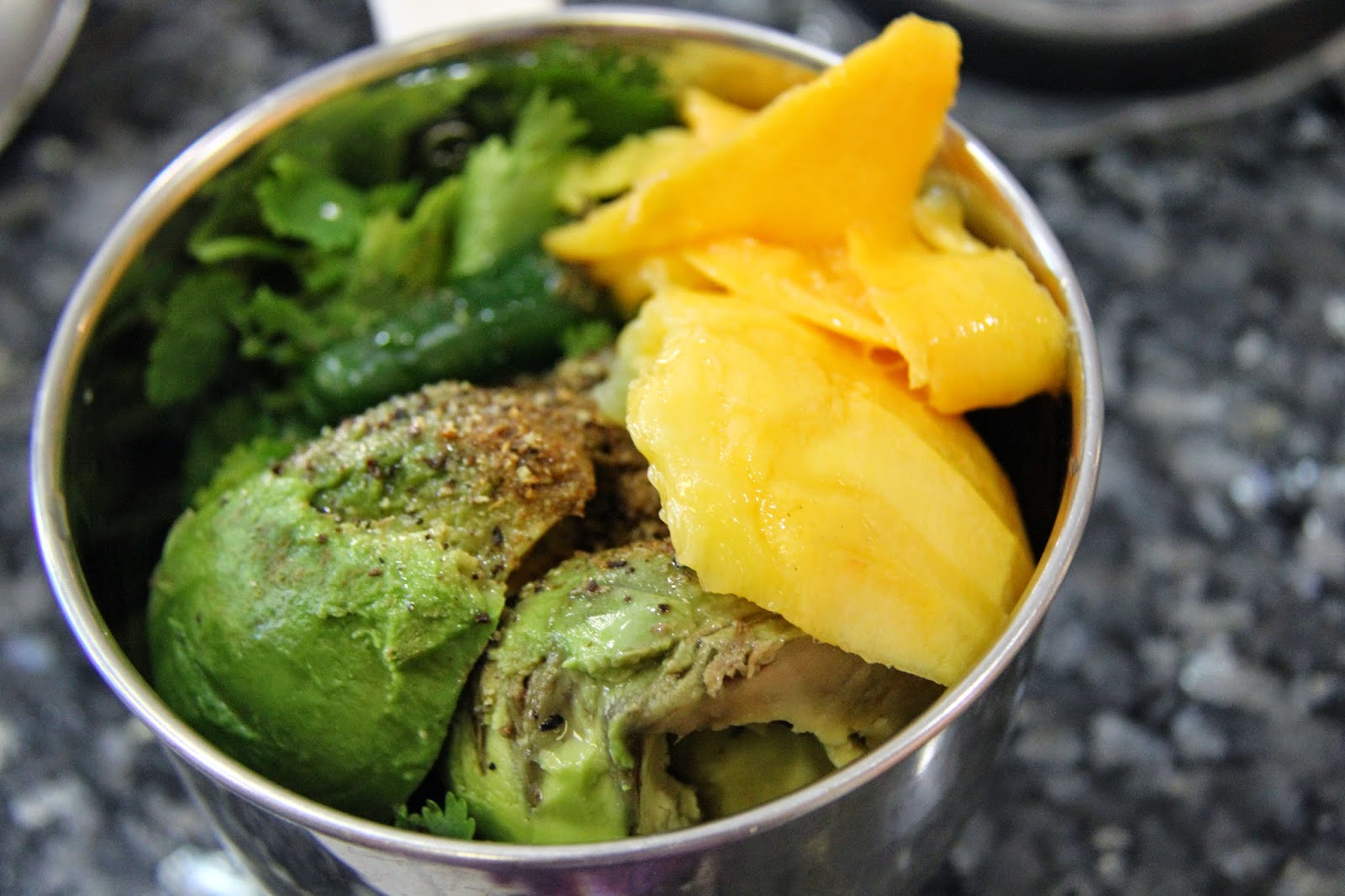 1.For the dressing, take the cilantro,avocado,garlic,lemon juice,mango,black pepper powder,jalapeno,cumin powder,coriander powder and salt in a blender and blend until smooth.