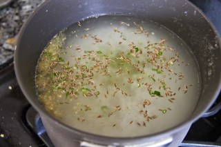 1.In a large pan boil 2 cups of water add the sabudana along with the water it is soaked in and the salt,green chili and cumin seeds and keep stirring until the tapioca gets transparent.Turn off the stove and let cool for 10 minutes.