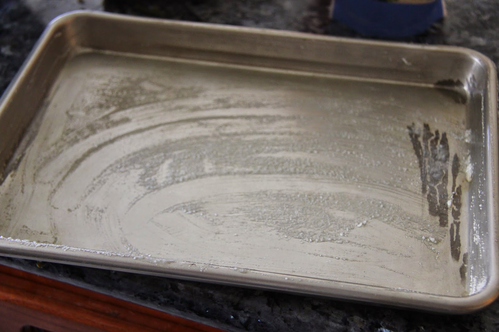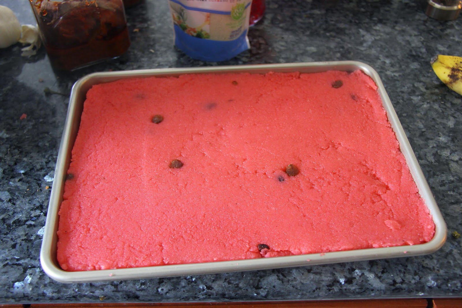 6.Transfer the mixture to the sheet pan that has been previously greased with ghee and spread the kesari in it and flatten it well.
