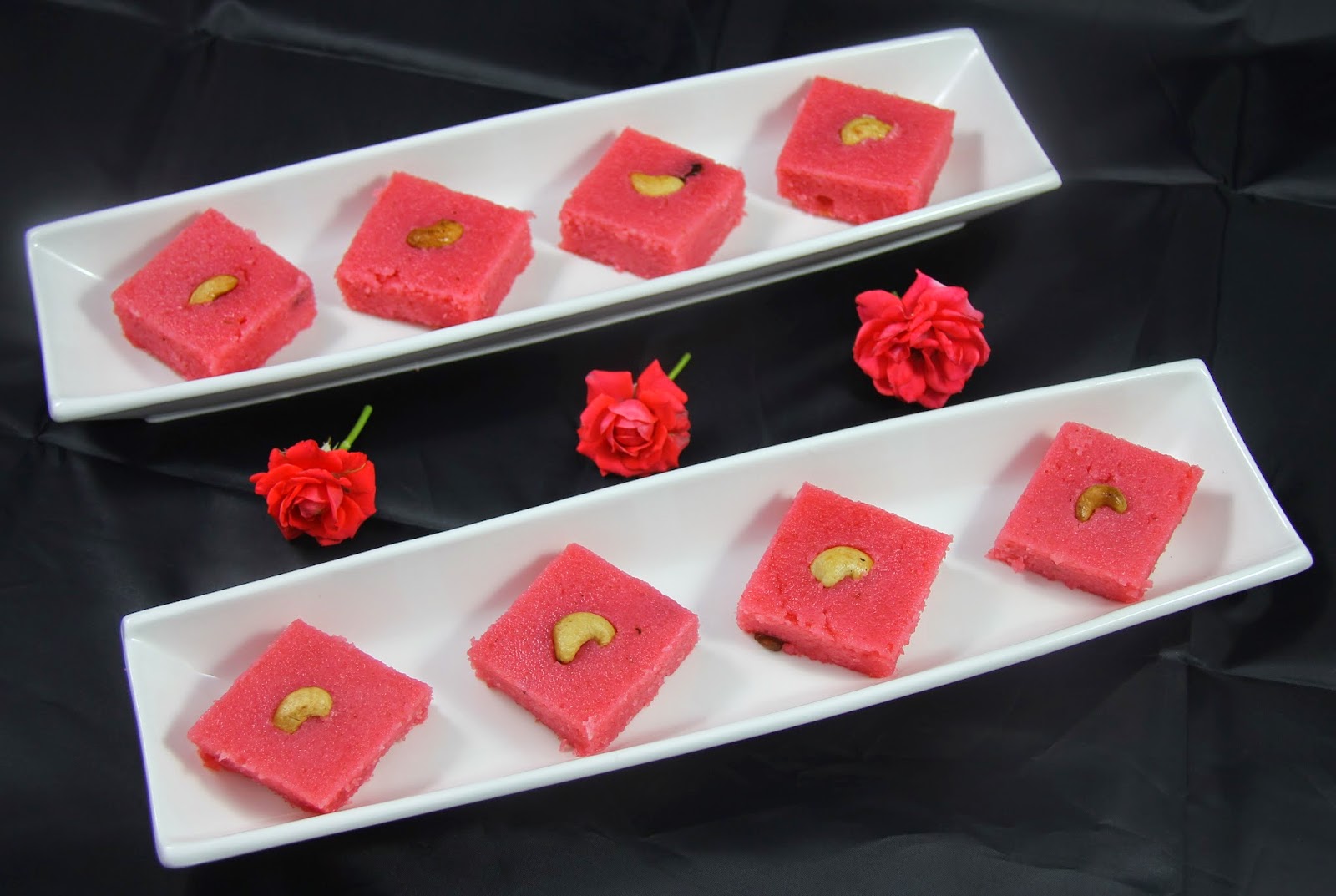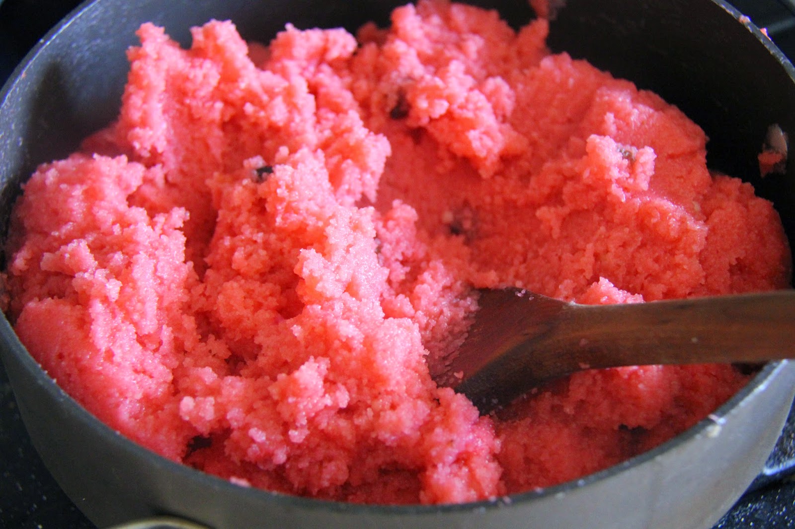 One of my friend had a baby recently and I was looking for a simple dessert to make for her.Kesari came to my mind,my mom makes it very well but I couldn’t reach her by phone,so I experimented on this one and came out very good.Heres a variation of kesari with rose syrup commonly used for falooda.
