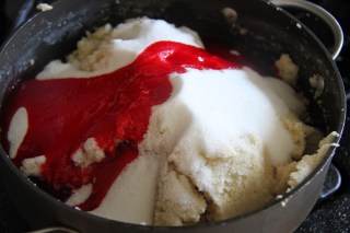 5.Add the rose syrup,raisins and sugar and stir well. The mixture will now start to get a little watery due to the sugar,mix well and mash the lumps to get a uniform color.Keep stirring for about 5 minutes till the mixture starts to turn in one big lump and not sticking to the pan.