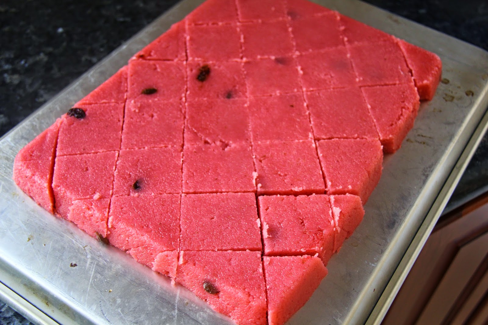 If you have cookie cutters,you can use those to form your favorite shapes from the sheet of kesari you made.