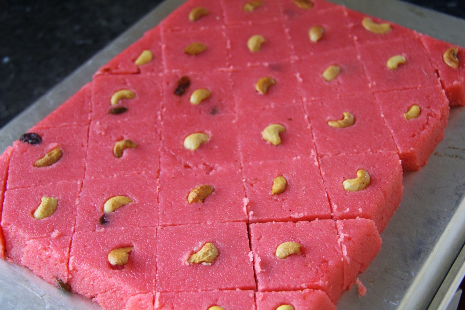 7.After it completely cooled down cut the kesari into diamond shapes and press a cashew on each piece and serve.
