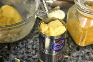3.Grease the Kaarappoosa press with some oil,place the kaarappoosa plate(mould ) in it and place a handful of dough in the press.