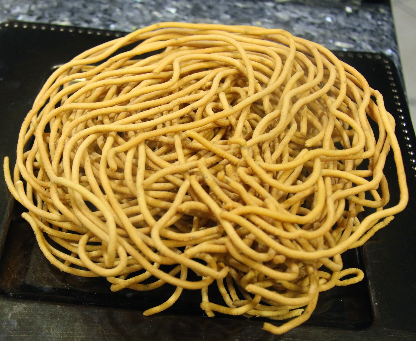 4.The temperature of the oil can be tested by dropping a drop of dough in the oil it should float back up immediately to the surface.In a circular motion gently and quickly press the dough through the mould to form thin strings of dough into the oil.Let fry until the reach a golden brown color,gently flip the kaarappoosa and let fry on the other side and remove from the oil to drain on a kitchen towel.