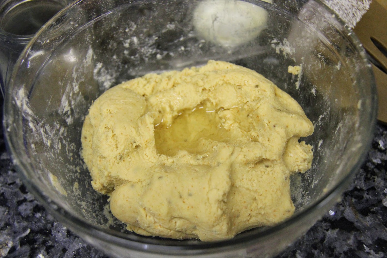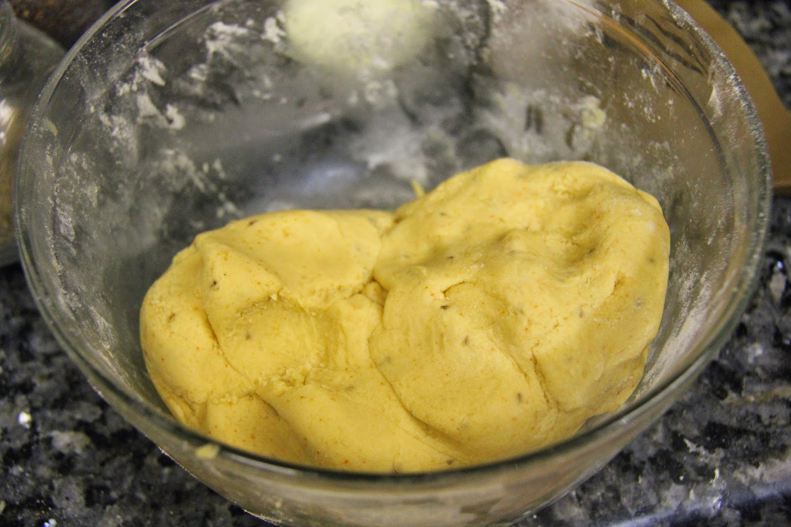 2.Add about 1/2 cup water little by little to form a firm dough.Add 2 teaspoons of the heated oil in the dough and mix well.