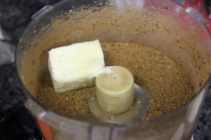 2.Add the cocoa powder,graham cracker crumbs,brown sugar and butter and pulse until crumbs form and the mixture will come together.