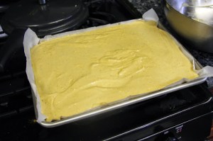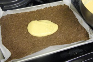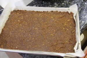 3.In a half baking sheet,line it with parchment paper and transfer the mixture to the paper and press down firmly in a uniform layer.