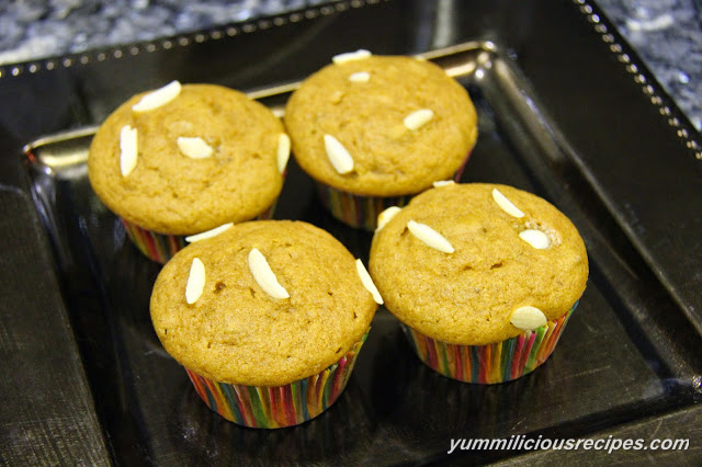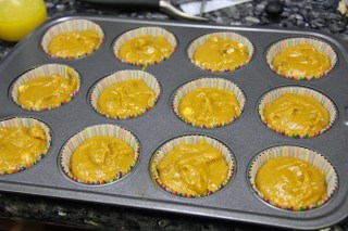 7.Line the muffin tins with muffin cups and Scoop the batter into each.Sprinkle on top with pecans and chocolate chips if you like.I ran out of pecans so I added some slivered almonds but pecans make the best pairing.