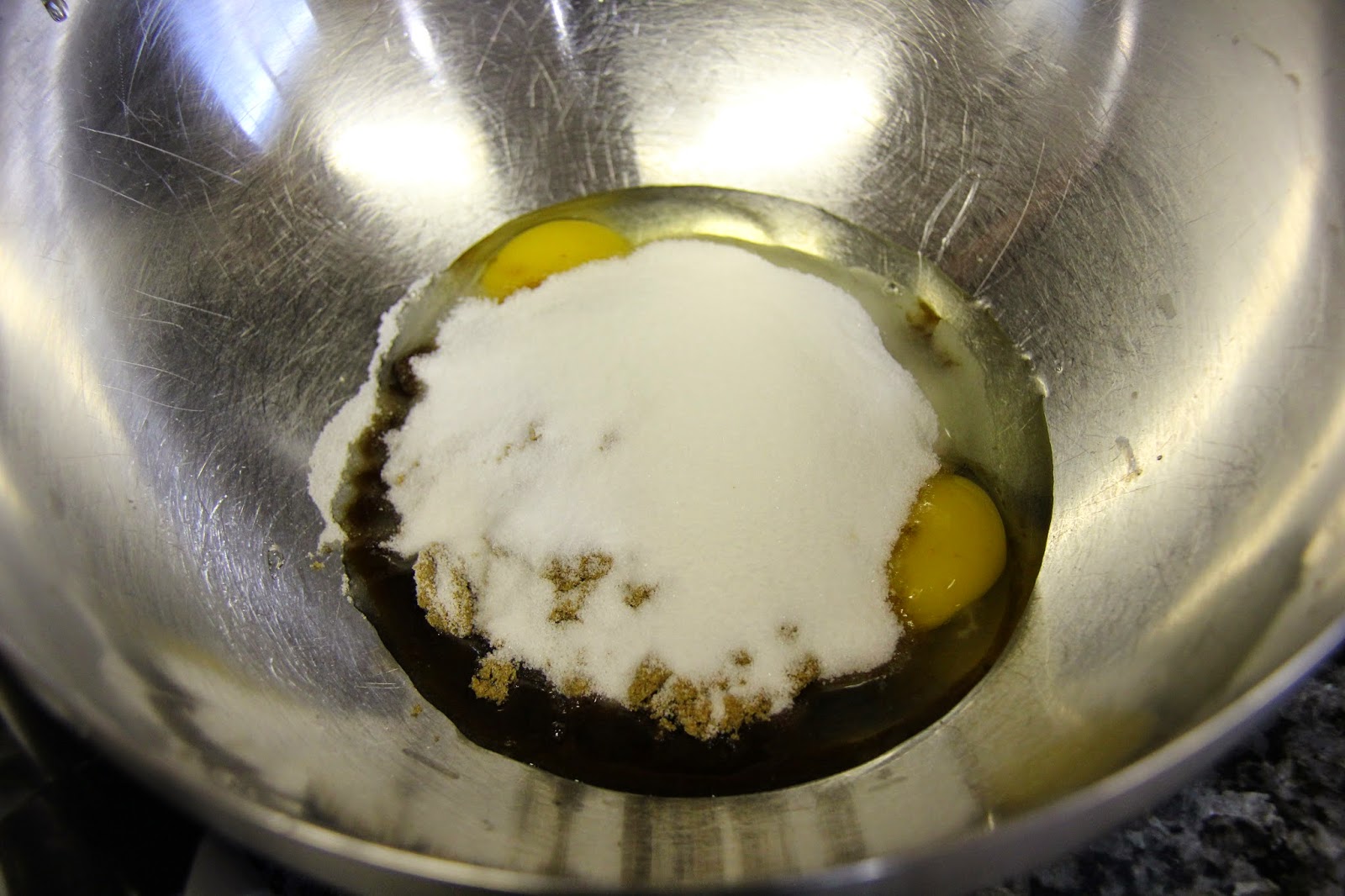 3.Whisk in sugar,brown sugar,eggs,pumpkin pie spice and vanilla essence for 2-3 minutes on high speed until foamy.Add the oil and fold in.