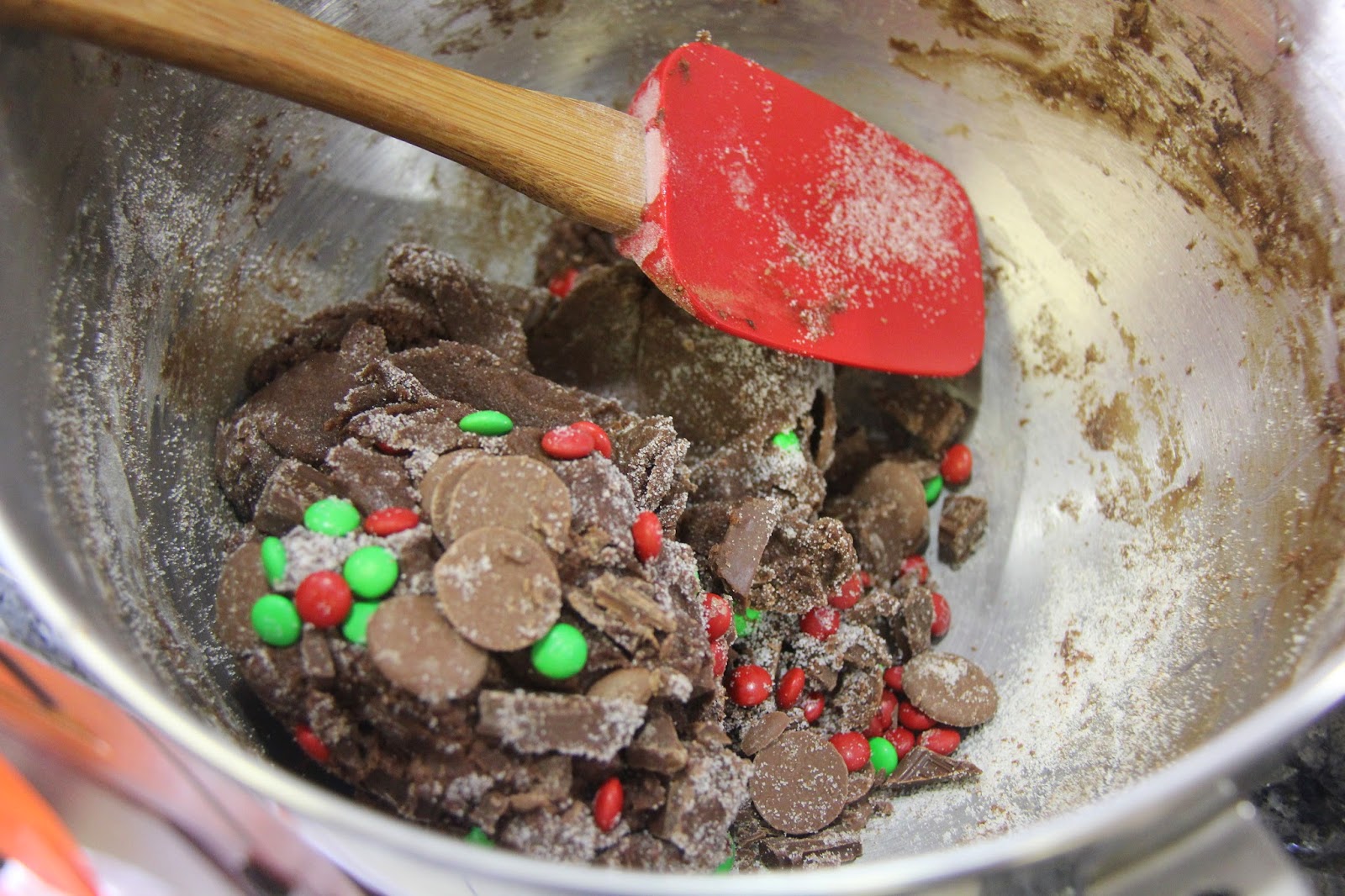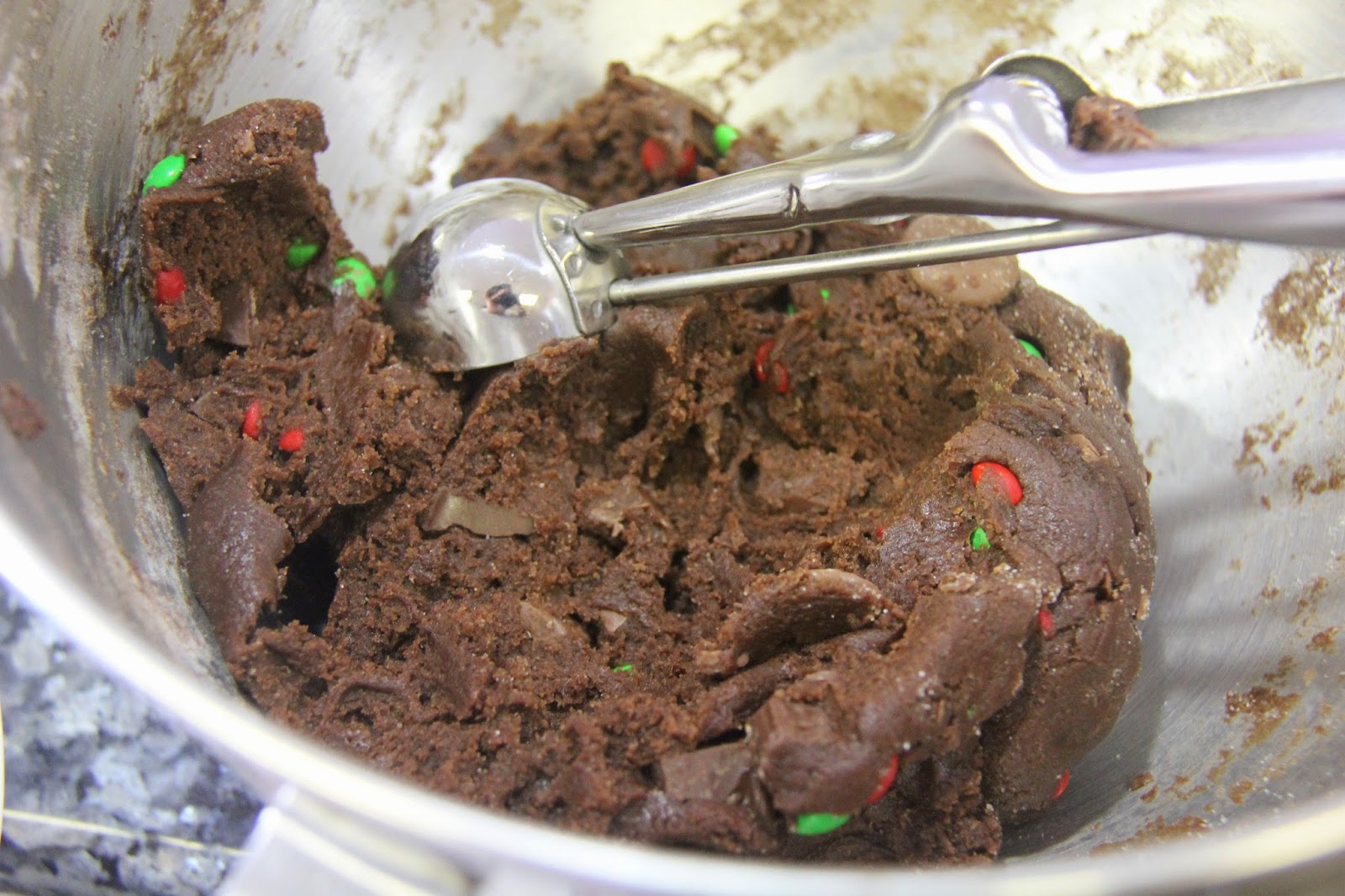 4.Add the flour mixture and mix just until combined.The dough should be firm to be able to be rolled into balls,else add half cup of flour.Fold in the chocolate chips and M and Ms