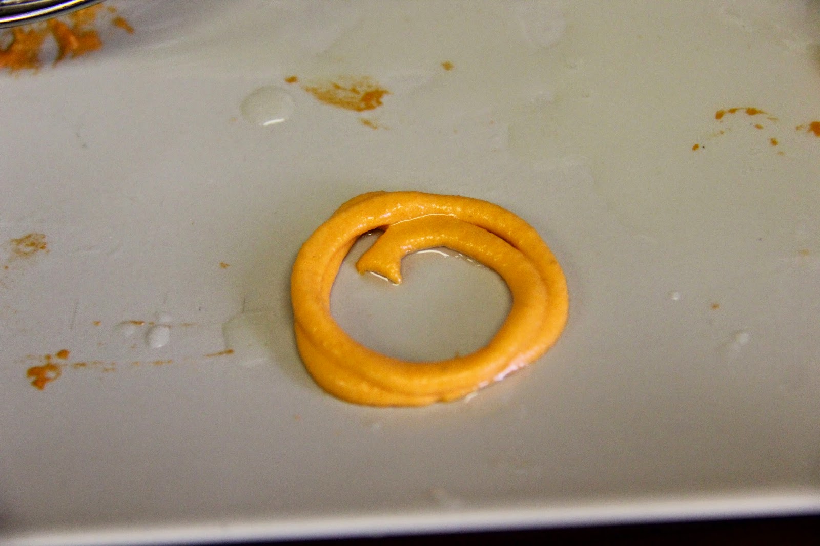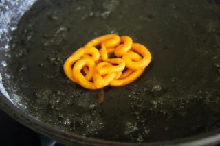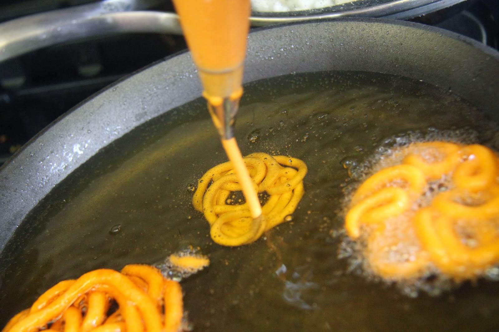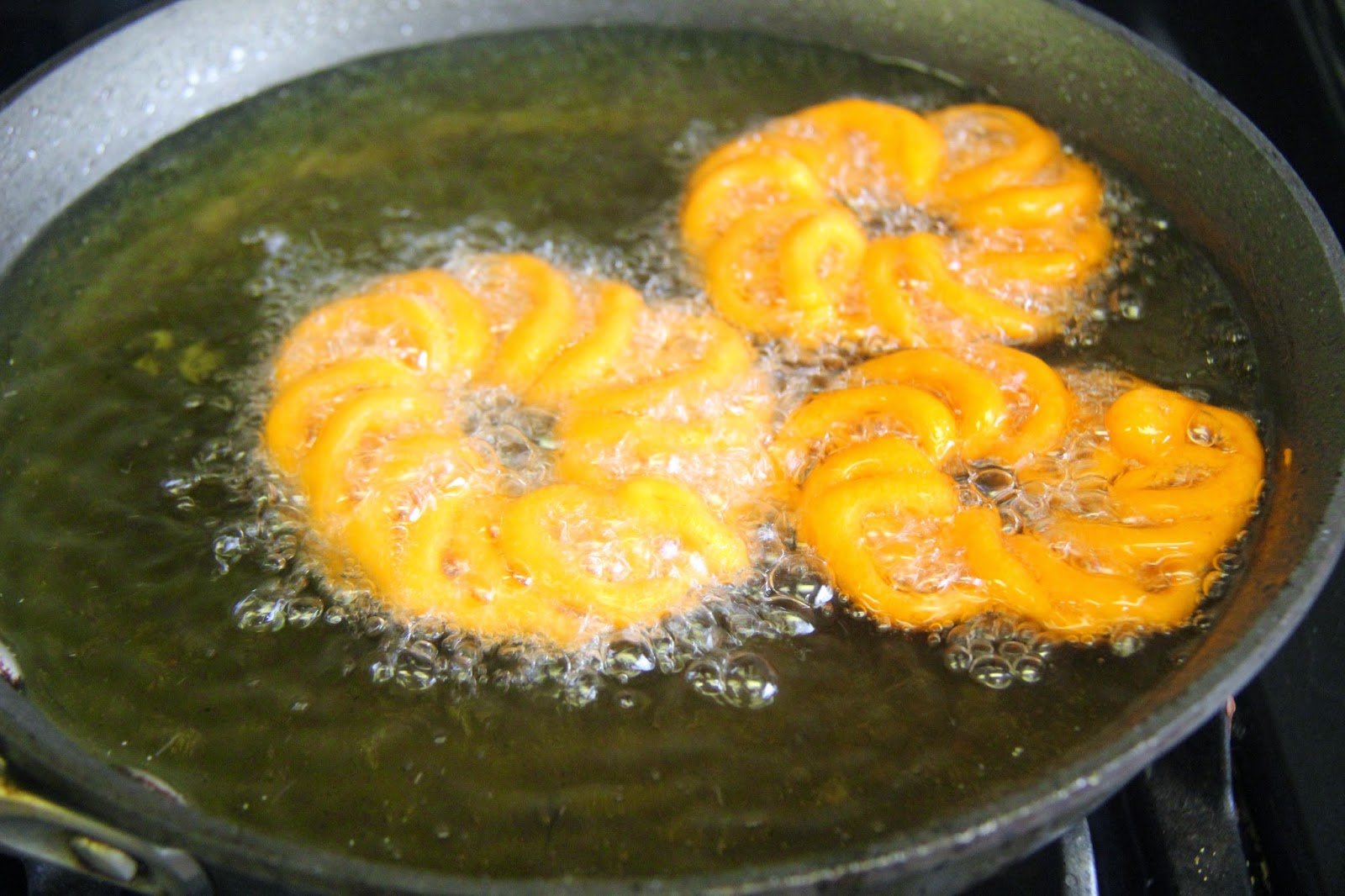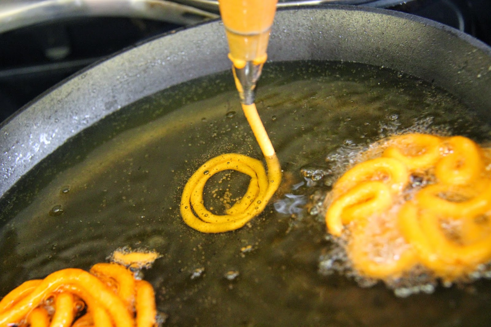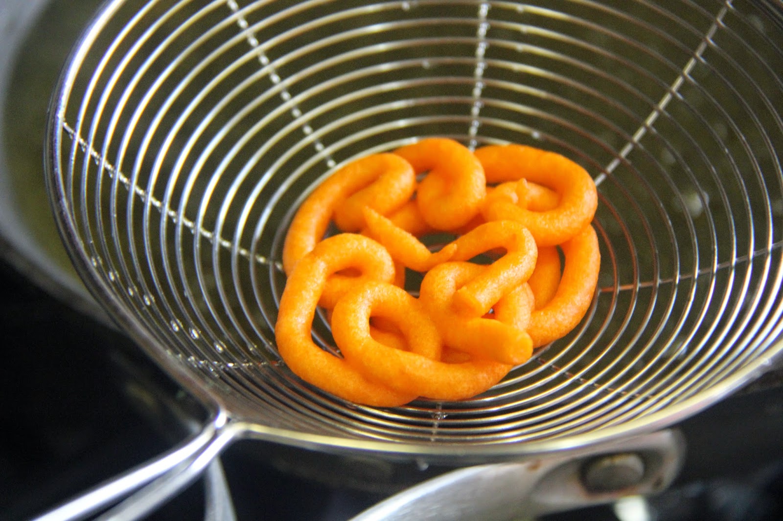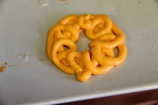 Make sure while piping the oil is on a medium-low flame and once you have piped it you can increase the flame to a medium-high or you wont be able to pipe the shape.