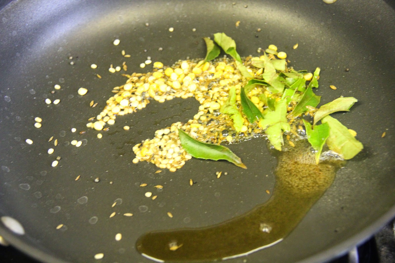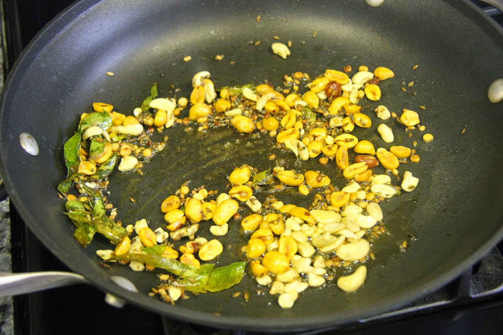 1.In a pan,heat oil/ghee and add mustard seeds and let them splutter.Now add the chana dal,black gram,cumin seeds,cashew and peanuts and saute for about 1 minute and add the curry leaves and let splutter.